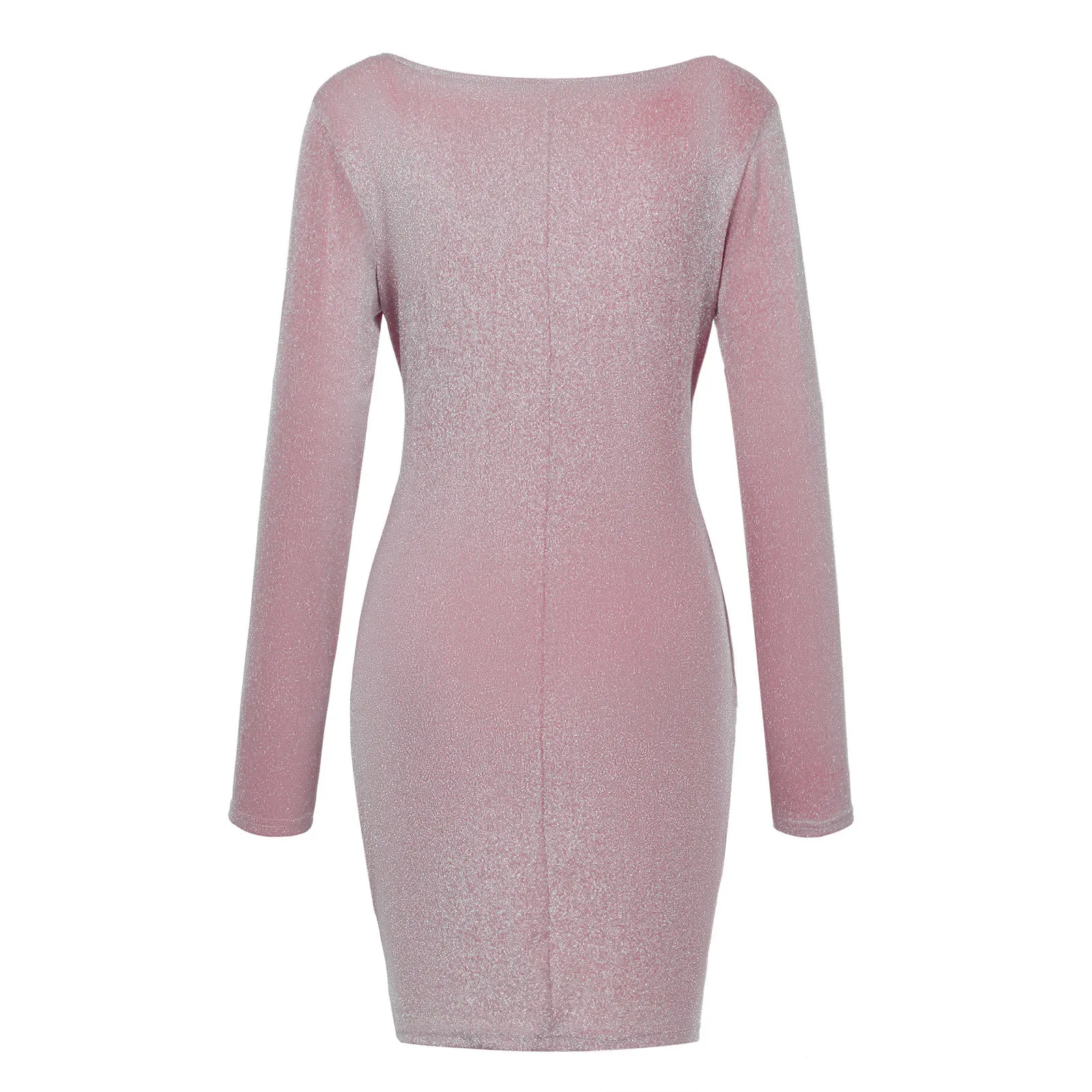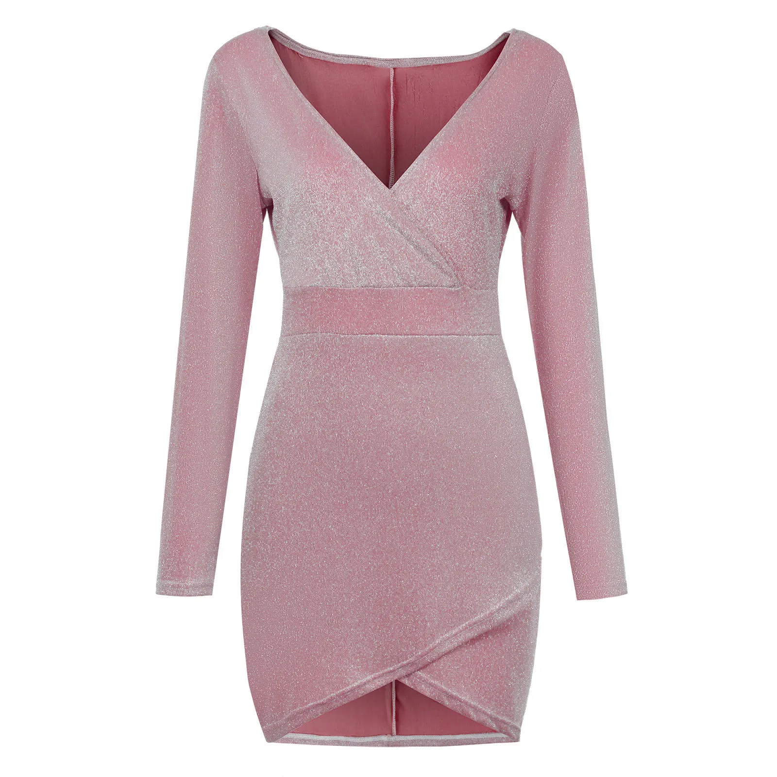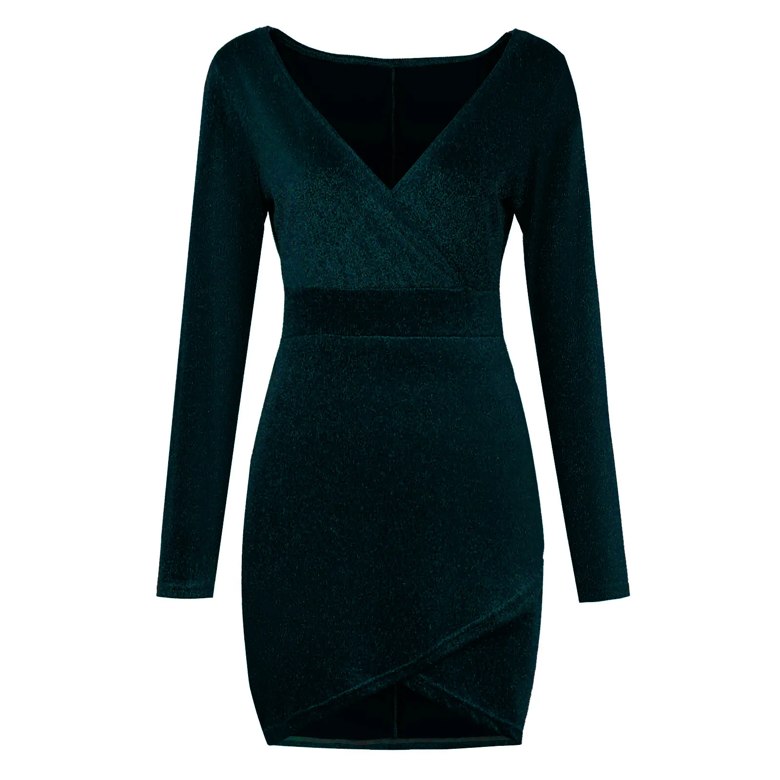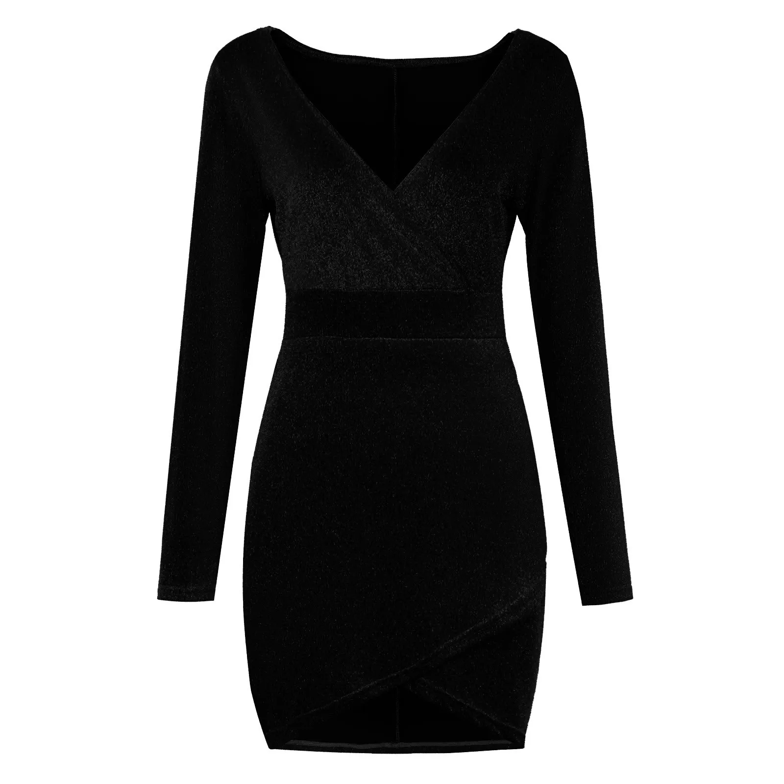 Женское однотонное платье с V-образным вырезом и блестками, вечерние мини-платья, облегающее платье с длинным рукавом, сексуальное винтажное платье для ночного клуба