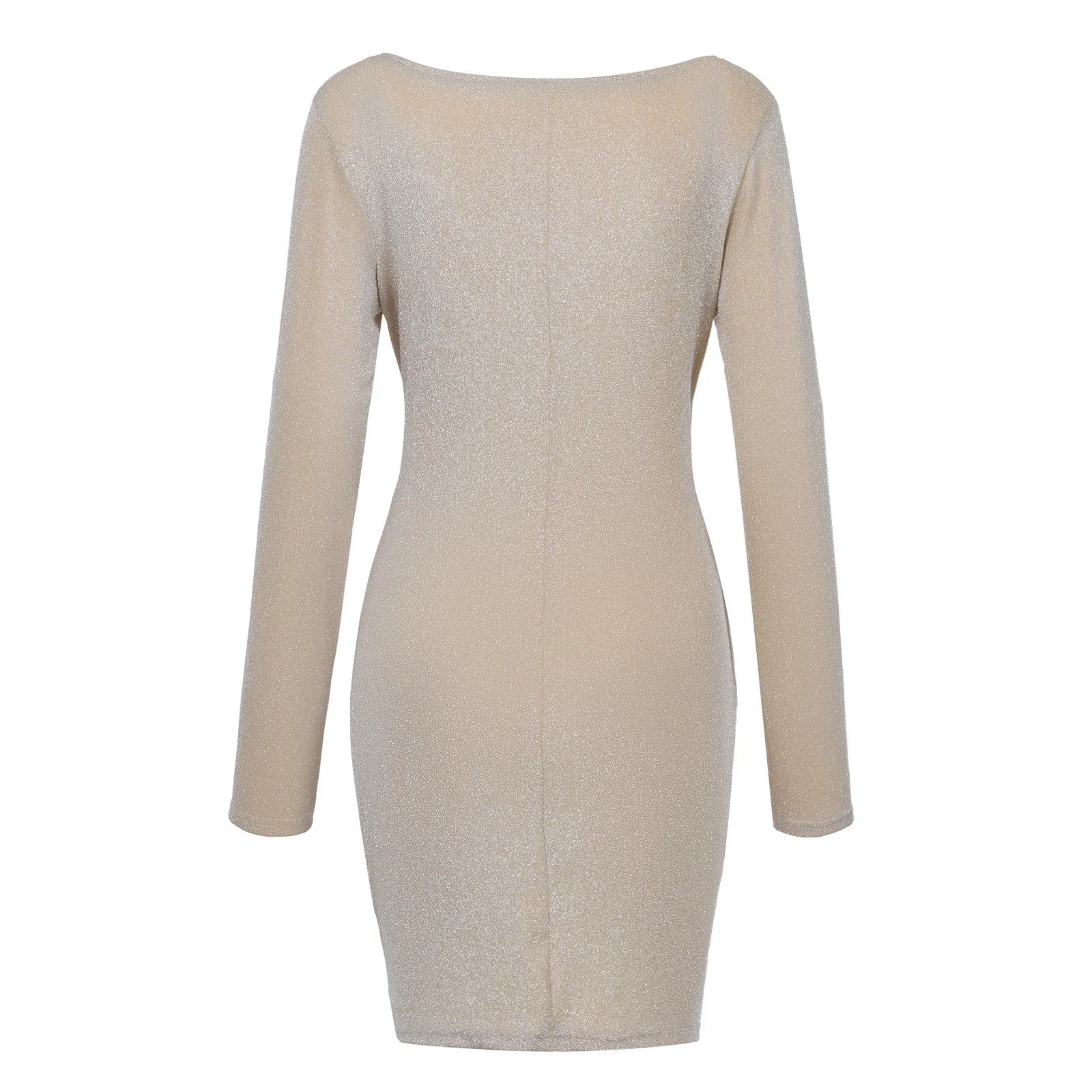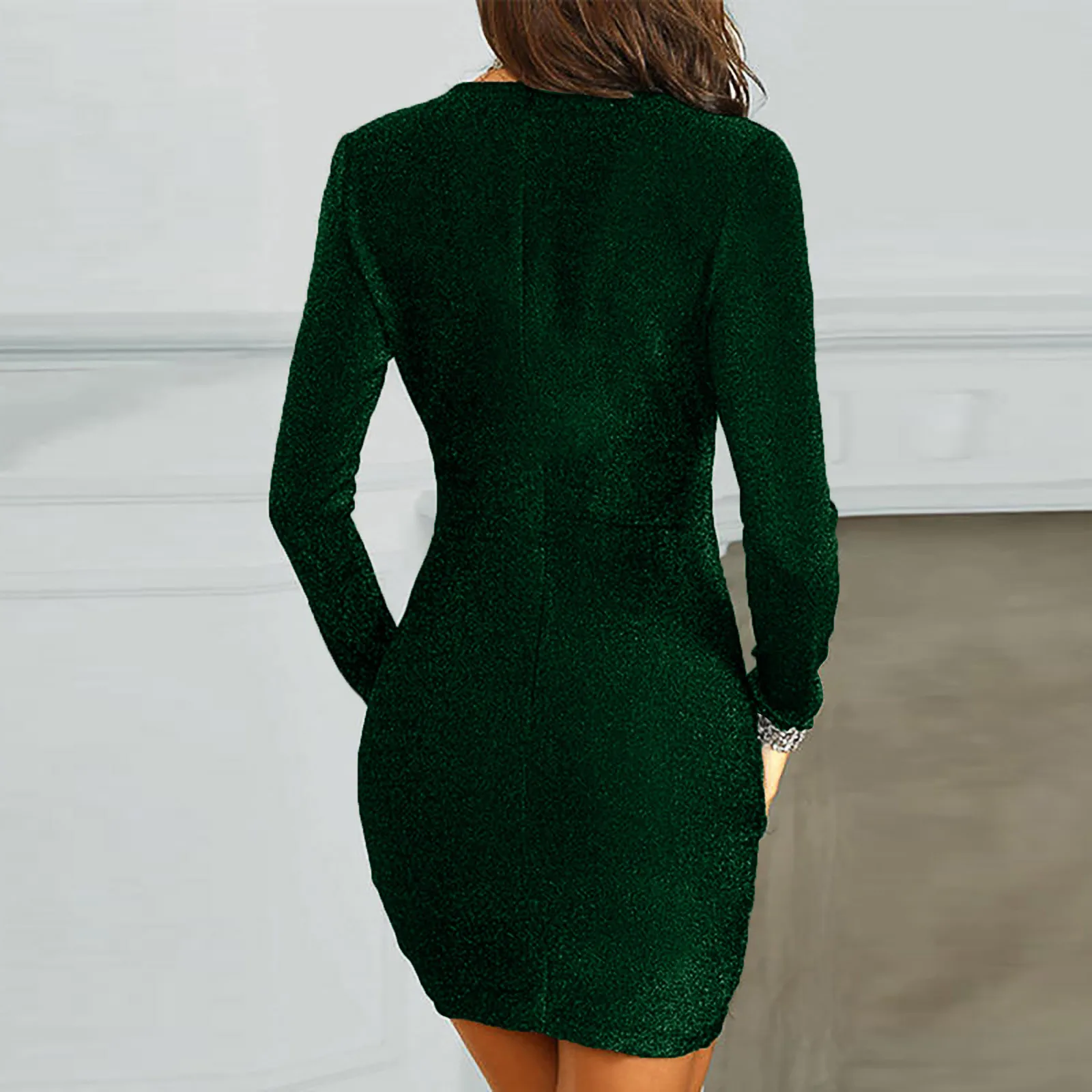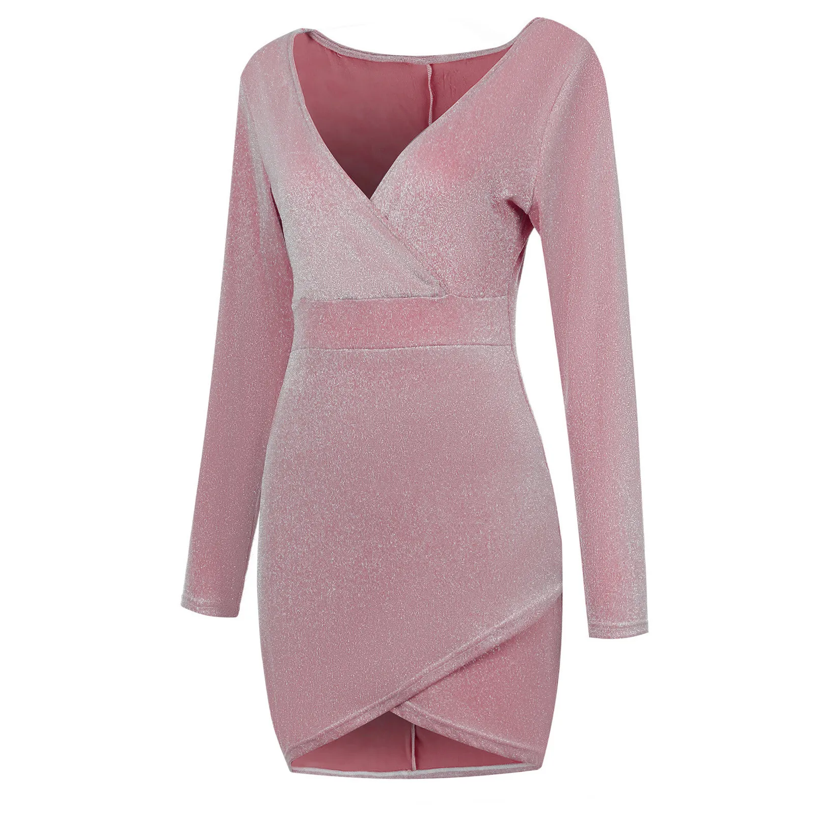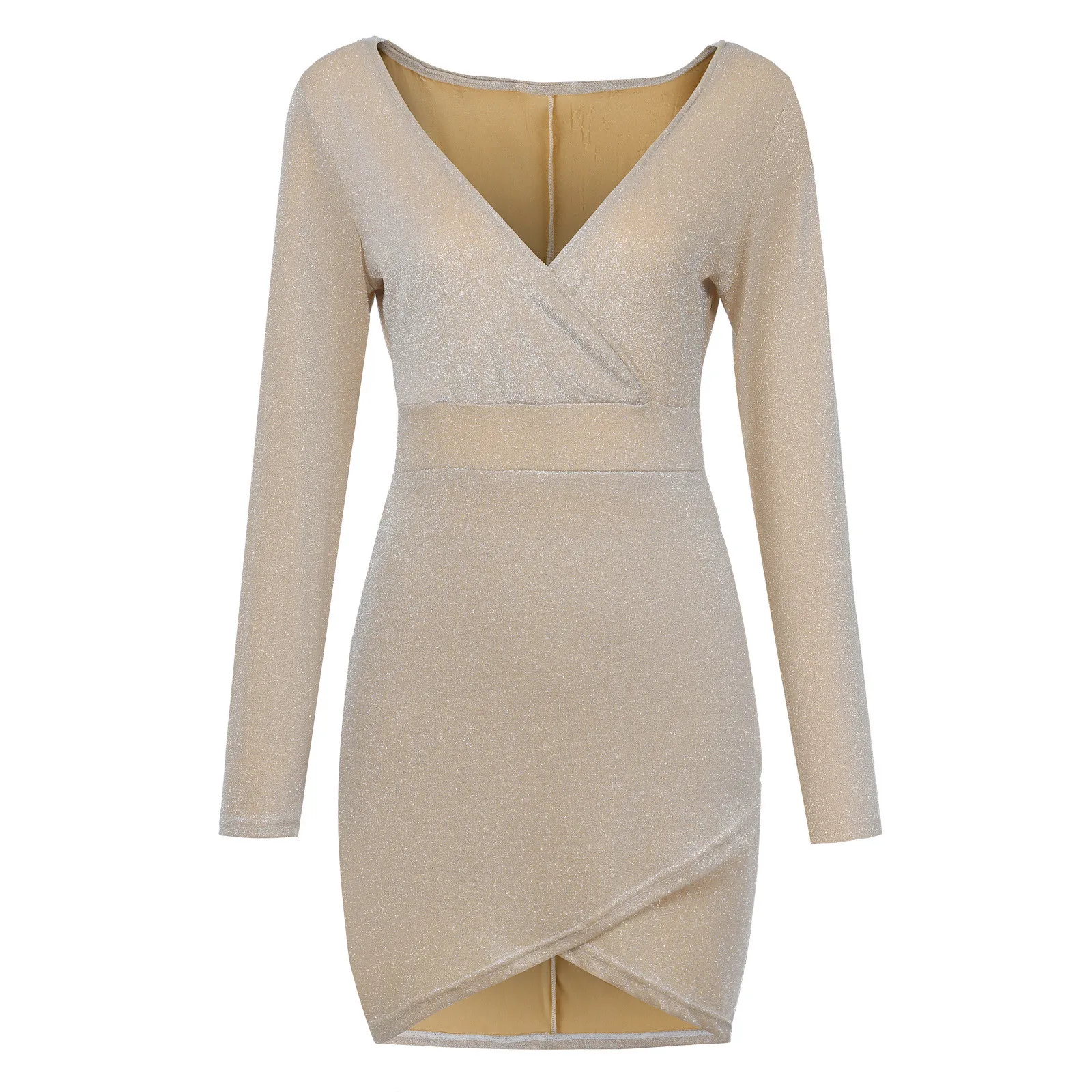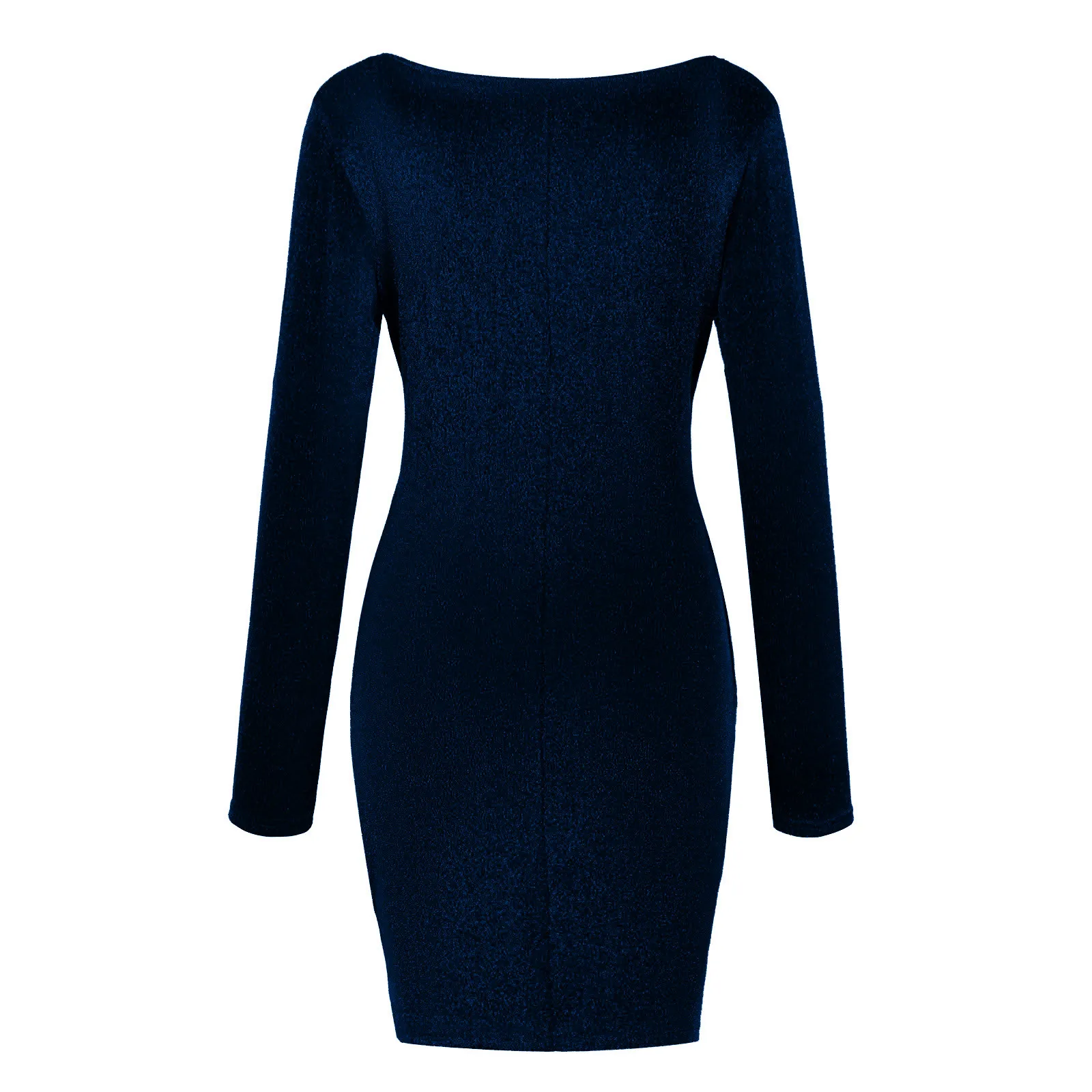 Женское однотонное платье с V-образным вырезом и блестками, вечерние мини-платья, облегающее платье с длинным рукавом, сексуальное винтажное платье для ночного клуба
