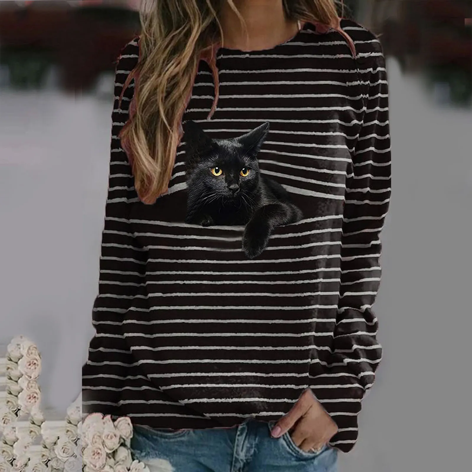 Женские футболки размера плюс Графические футболки для женщин; Большие размеры размера плюс с длинным рукавом 3D и принтом кошка, футболки с круглым вырезом, футболка, женские футболки