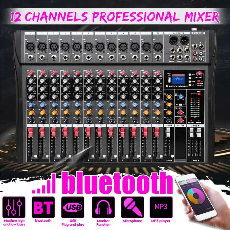 Микшерный пульт, 12 каналов, стереозвук, bluetooth, USB, запись, воспроизведение компьютера, фантомное питание, USB, цифровой аудиомикшер, усилитель