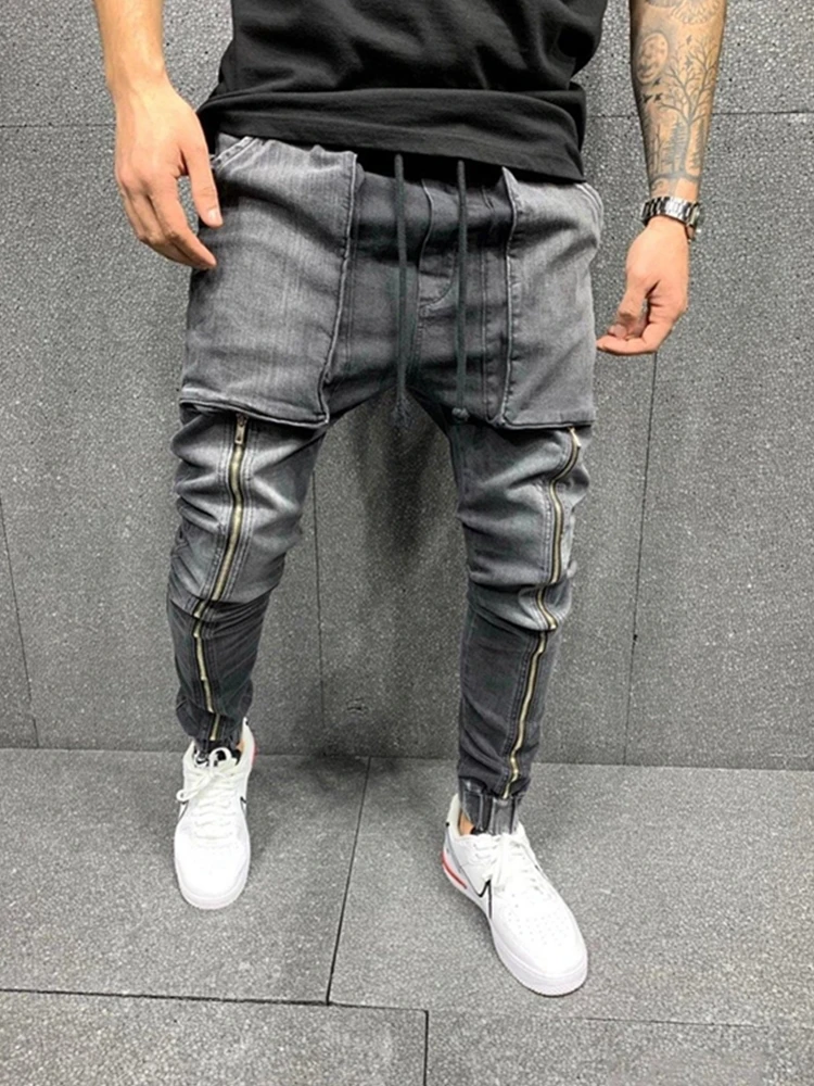 Мужские узкие джинсы с карманами, Узкие рваные джинсы, высокие Стрейчевые синие джинсы для мужчин, потертые шаровары на молнии с эластичным поясом