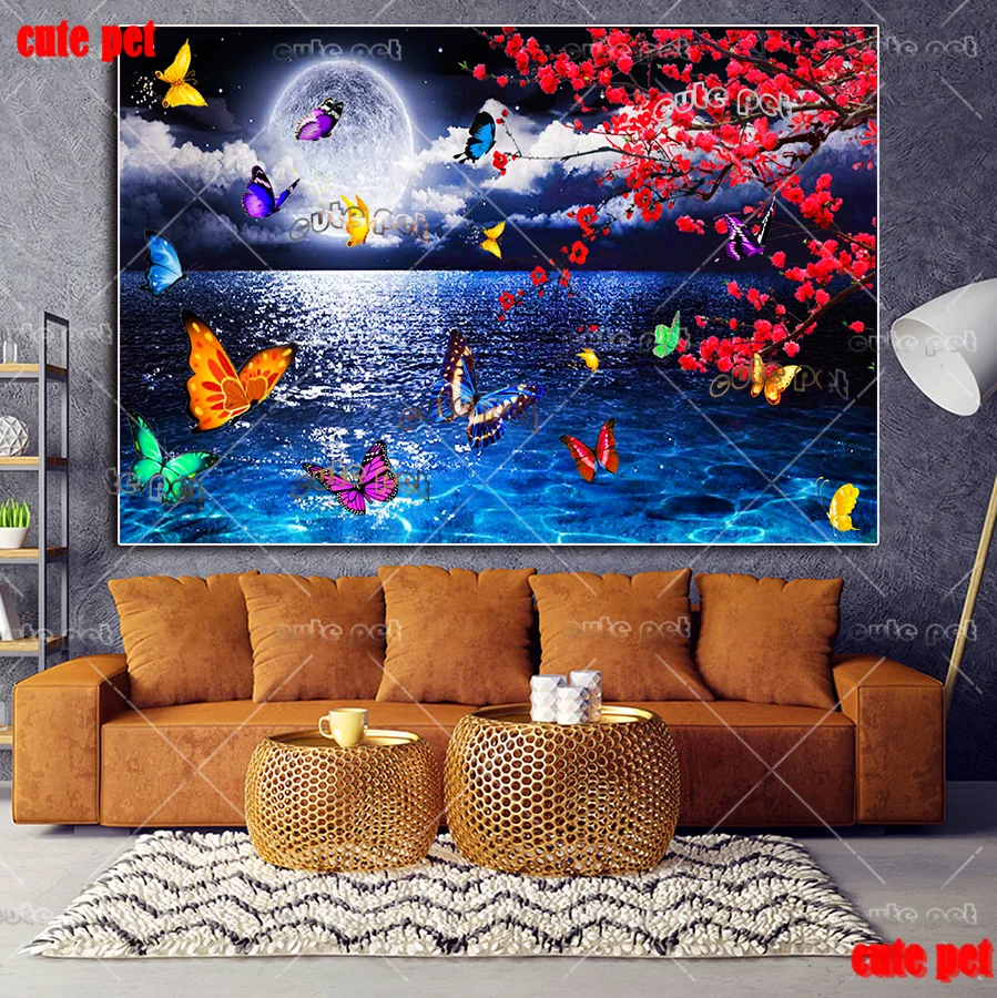 5D алмазная живопись, Бабочка, луна, полная Алмазная вышивка, узор стразы, декор ночного озера, вышивка, сделай сам, мозаика, украшение