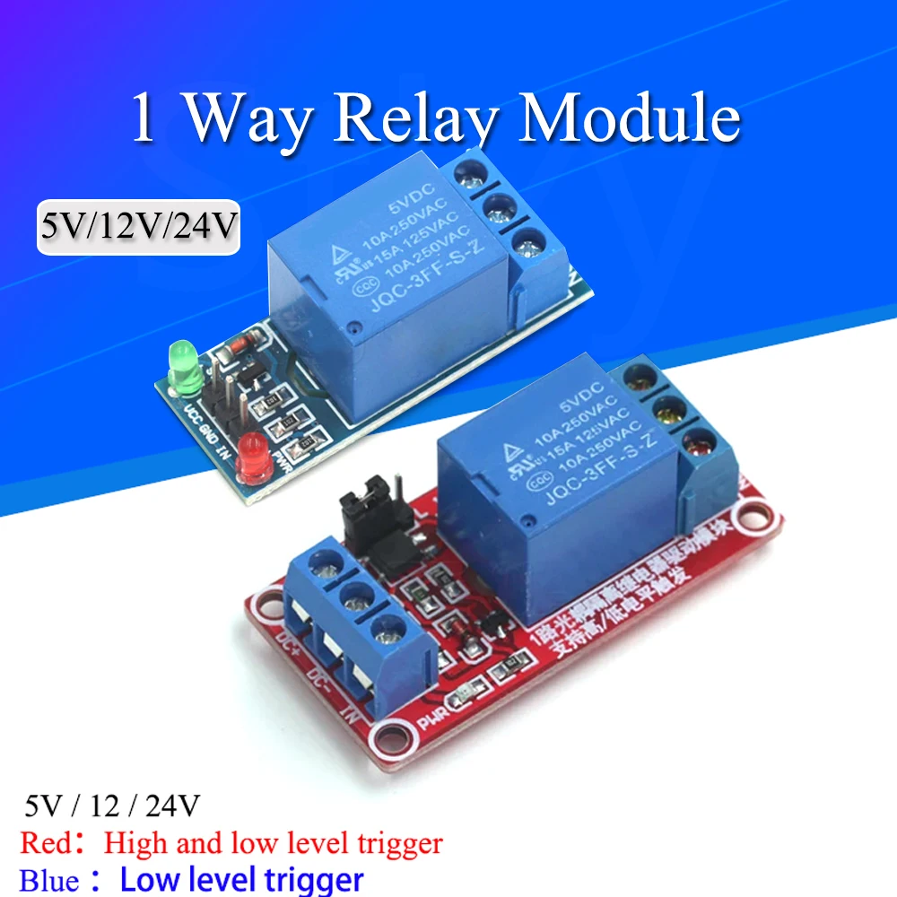 Красное реле поддерживает Запуск высокого и низкого уровняСинее реле поддерживает Запуск низкого уровняОписание модуля:1. В модуле используется реле подлинного качества, нормально открытые интерфейсы, Максимальная нагрузка: 250 В/10 А переменного тока, 30 В/10 А постоянного тока;2. Использование изоляции оптопары SMD, способности к вождению, стабильной производительности; Пусковой ток 5 мА;3. Рабочее напряжение модуля 5 в 12 В 24 В;4. Модуль может быть высоким или низким, используя триггер настройки перемычки;5. Устойчивая к отказу конструкция, даже если управляющая линия сломана, реле не будет работать;6. Индикатор питания (зеленый), индикатор состояния реле (красный)7. Дизайн интерфейса человеческого характера, все интерфейсы доступны через клеммные выводы прямого подключения, очень удобно8. Размер модуля: 50 мм * 26 мм * 18,5 мм (Д * Ш * В)Интерфейс модуля:1. DC +: положительный источник питания (VCC)2. DC-: отрицательный источник питания (GND)3. IN: может быть реле управления высокого или низкого уровняРелейные выходы:1. НЕТ: нормально открытый интерфейс реле2. COM: реле общего интерфейса3. NC: Нормально закрытый интерфейс релеВарианты запуска высокого и низкого уровня:Это низкоуровневый триггер при подключении перемычки к низкому контактуЭто триггер высокого уровня при подключении перемычки к высокому контакту.