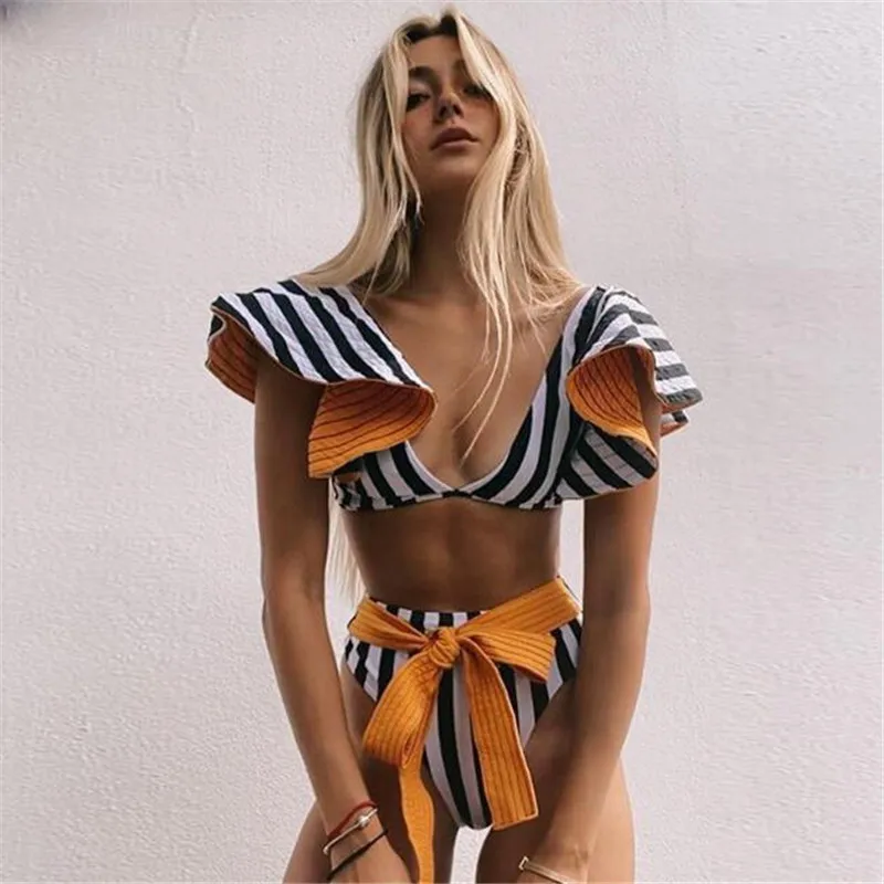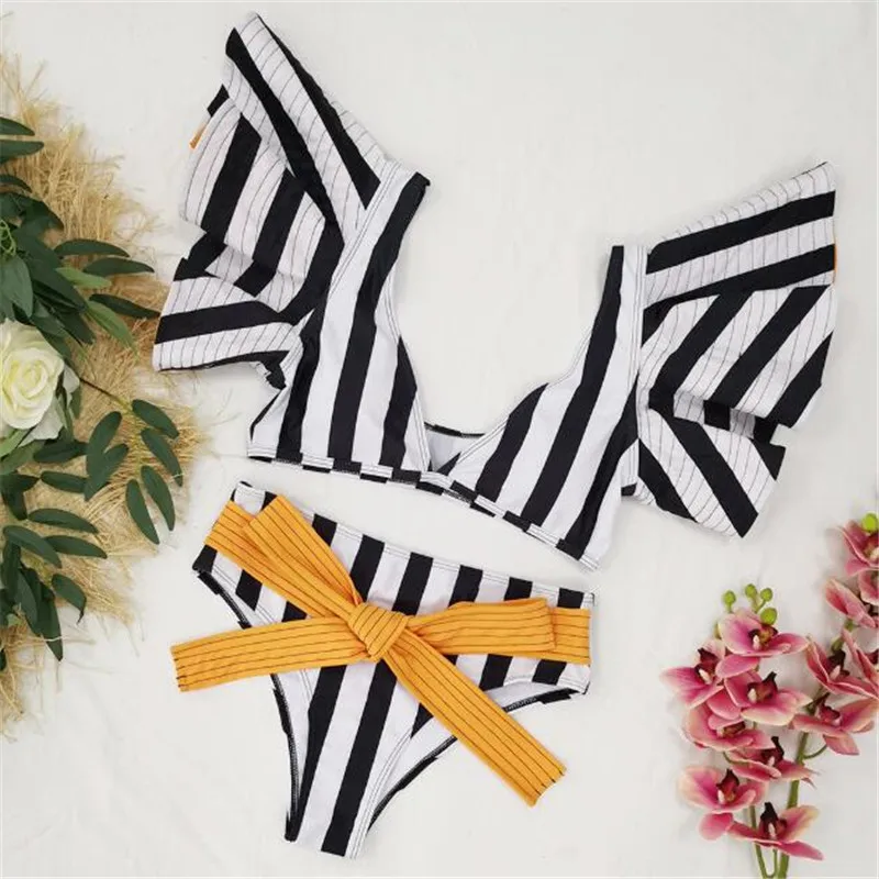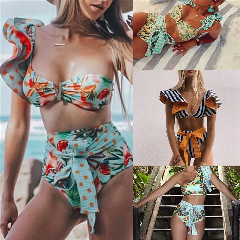 Комплект бикини с завышенной талией 2021, Женский бандажный купальник бикини пуш-ап, женский купальник из двух предметов с цветочными полосками и оборками, бикини на бретелях