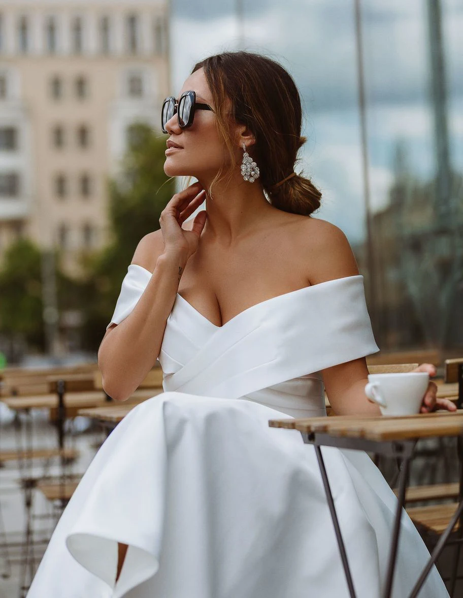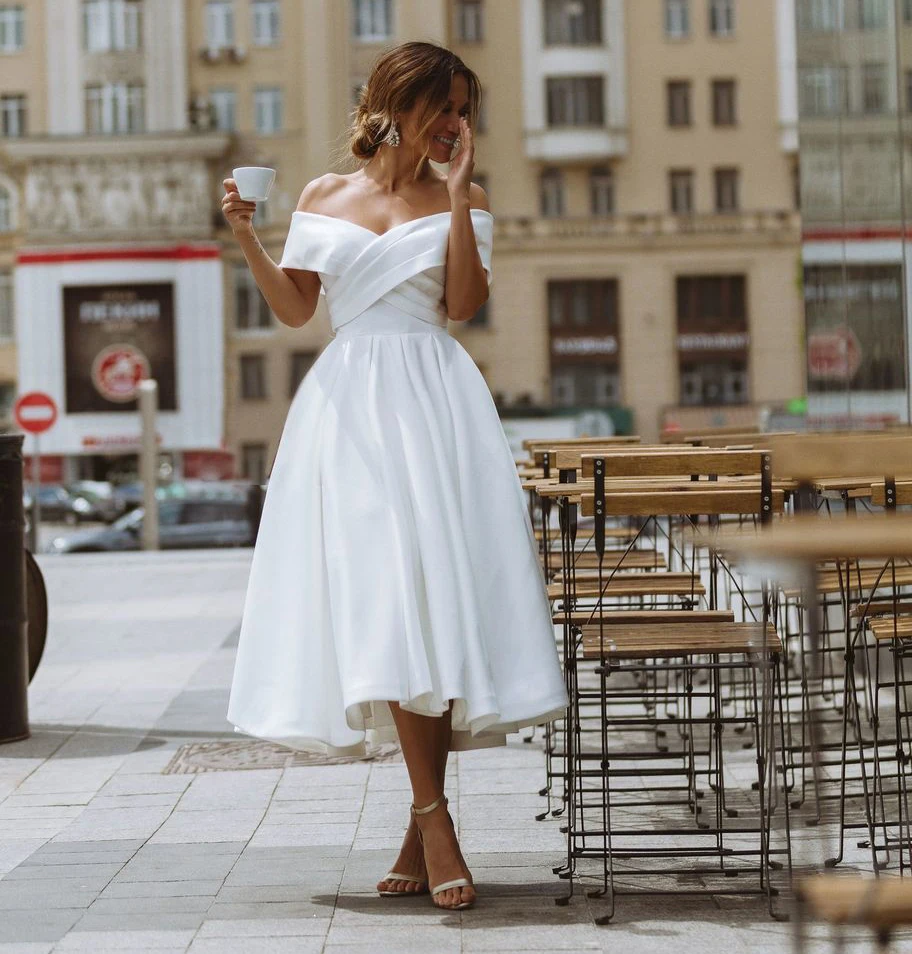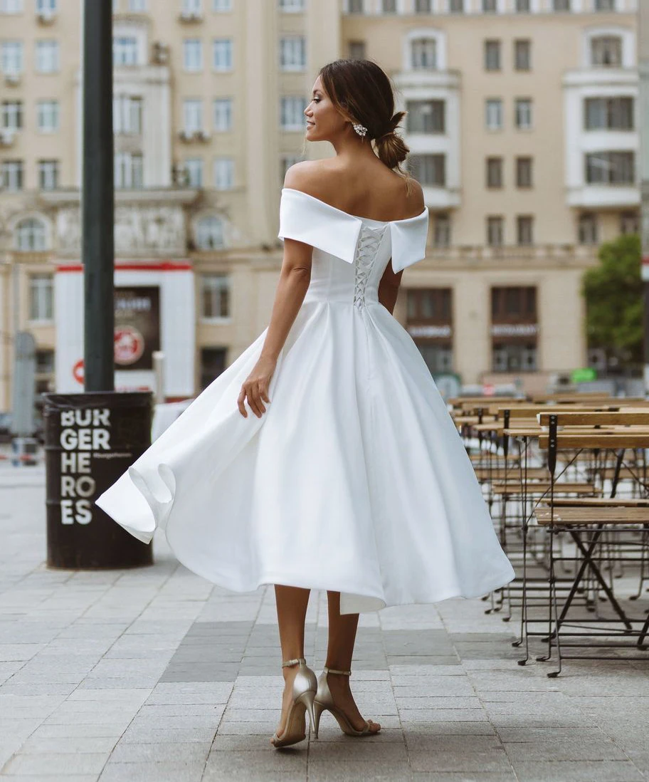 Белый сатин свадебное платье 2021 простой со спущенными плечами Чай-Длина платья невесты пляжные Короткое свадебное платье размера плюс