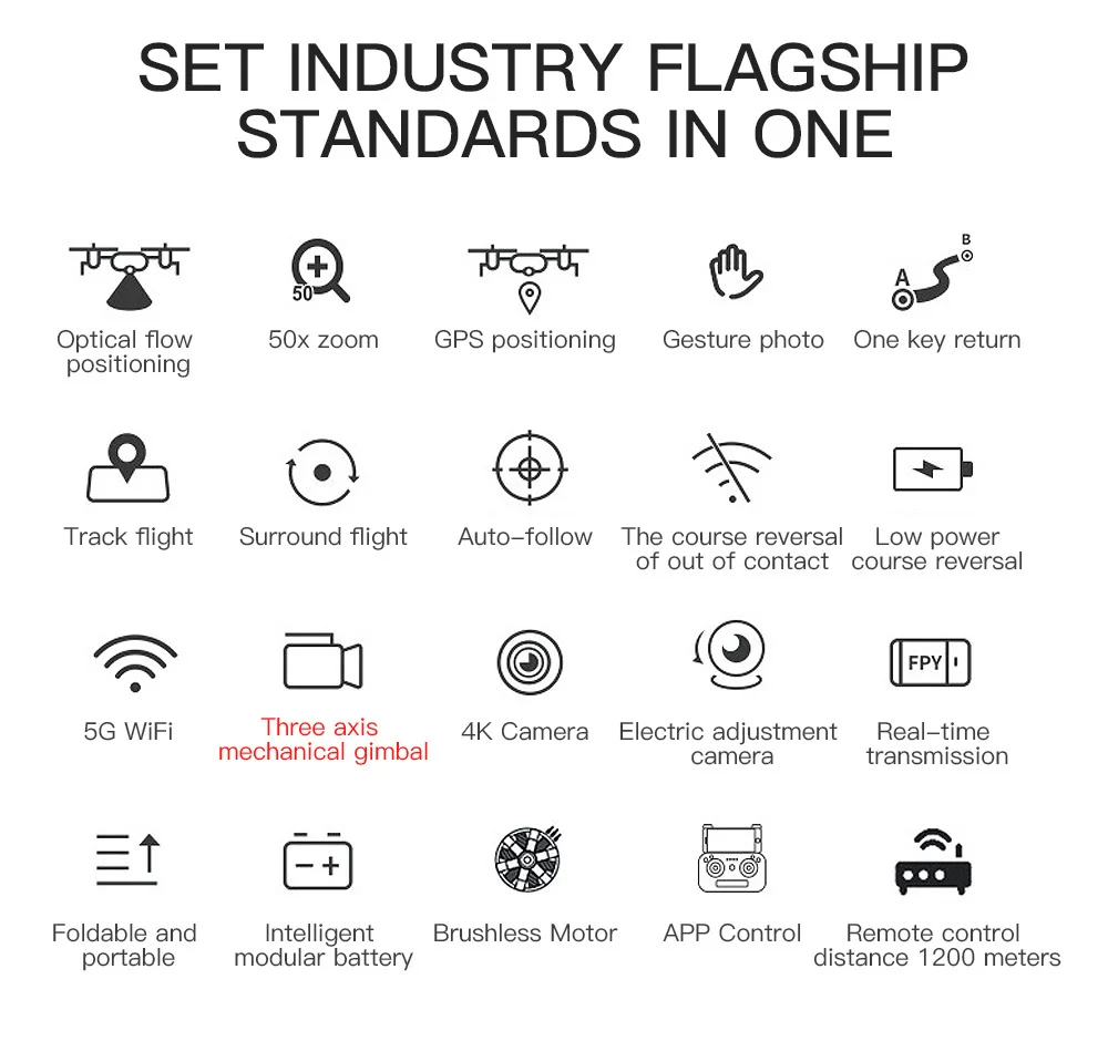 Особенности:1.GPS возвращается для начала точки и точки с низкой мощностью и без сигнала.2.GPS Smart следующее: после того, как самолет покинет GPS, он откроет следующую функцию приложения, и самолет будет следовать за мобильный телефон. Кроме того, следующее изображение: обнаружение объекта съемки и автоматическое отслеживание полета.3. Фотографирование и распознавание жестов: в пределах 1-3 м от самолета сделайте фотографический жестик/фотографический жестик перед камерой.4. Маршрут многоточечного планирования полета: самолет автономно летит после предварительно установленного маршрута, игрок фокусируется на съемке.5. Окружность с фиксированной точкой: Найдите центр окружности, а затем перемещайте желаемый радиус окружности через рокер.6. Отслеживайте и напоминайте Дрон: нажмите на значок gps-сигнала три раза, откройте интерфейс карты, карта показывает расстояние закрытия самолета, длину и широту положения.7. Фото и видео обмен: фотографии могут быть разделены индивидуально или выборочно, и видео можно делить только один за другим.Описание:Функция: складной, запуск одной кнопкой, посадка одной кнопкой, высота удержания, постоянная оптическая подача, двойная камера, Wi-Fi подключение, управление приложением, фото жестов, запись жестов, Inteigent IPP Next, следуя режиму me, управление ладонями (снизу слева направо), полет в точку, точки заинтересованности, контроль скорости, Передача в режиме реального времени, MV изображение и видео обмен, GPS домашний возврат.Характеристики:Наименование товара: Бесщеточный Дрон SG906 RCДатчик давления: регулировка высотыЧастота: 2,4 ГГцКамера: широкоугольная камера 4K 120 ° (регулируемая камера передатчиком, 60 °)Емкость интеллектуального литиевого аккумулятора: 7,4 в 2800 мАчУдаленная Батарея: 4x15V "AA" батареяМотор: 1806 бесщеточный моторАккумулятор дрона: 7,4 в 2800 мАчВремя полета: около 23-25 минутВремя зарядки: прибл. 5 часовUsb-зарядка: 5 ВРасстояние управления: 800 м (свободное взаимодействие и отсутствие окклюзии)5G Wi-Fi расстояние передачи изображения: 350 м (свободное взаимодействие и отсутствие окклюзии)GPS следуй за мной: около 30 мИзображение Следуйте за мной: около 5 мСтреляет руками: 1-3 мЦвет: черныйРазмер дрона: 28.3x25.3x 7 см/11.12x9.94x2.75 дюймов (в разложенном виде) 17.4x8.4x 7 см/6.84x3.3x2.75 дюймов (в сложенном виде)Вес полета: 527 г/18,59 унцийНачальный вес: 527 г/18,59 унцийИнформация о посылка:Посылка: 28,5x23,5x11, 5 см/11,2x9,24x4,52 дюймаВес посылка: 1499,6 г/52,9 унцийСумка для переноски, посылкаПосылка включает в себя:1 Радиоуправляемый Дрон