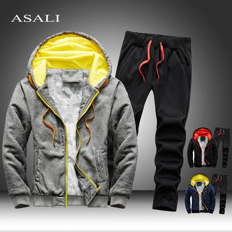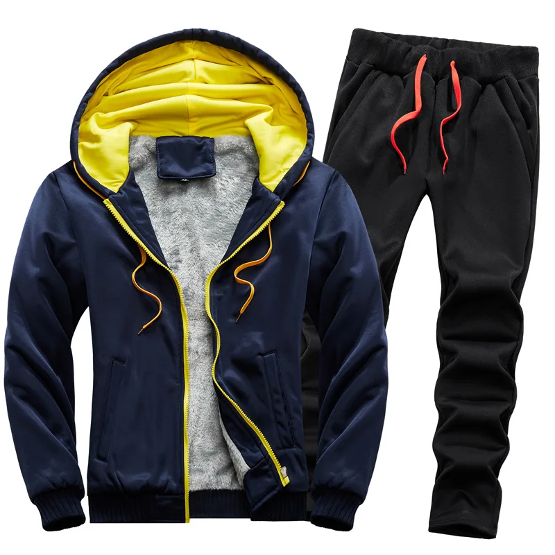 Мужской флисовый спортивный костюм, темно-синяя теплая толстовка с капюшоном и штаны на молнии, повседневная одежда для осени и зимы, 2019