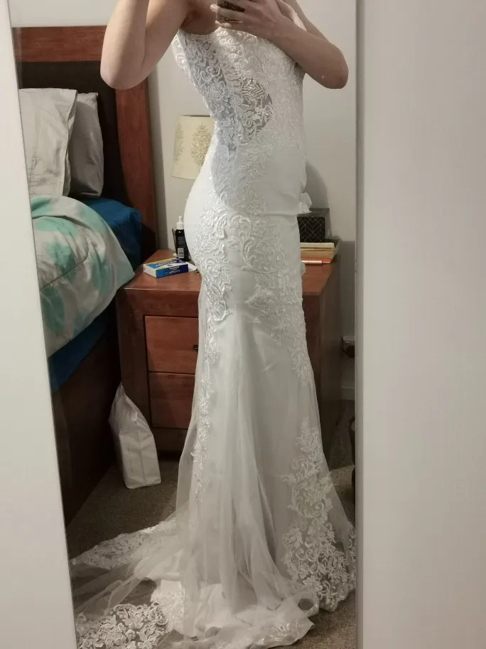 Милое платье. Я примерил Похожие стили в свадебном магазине, и я так рад, что жду и купил этот. Это очень точно из фотографий. Размер указан в месте. Качество превзошло мои ожидания. Продавец был очень коммуникативным и прибыл на неделю раньше!