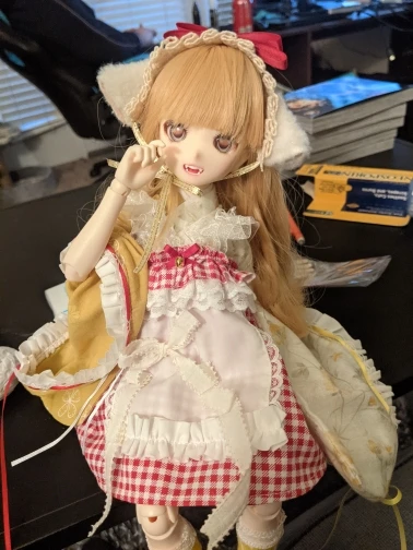 Она абсолютно красива! Если вы думаете о том, чтобы получить ее, и получить полный набор, потому что я обещаю вам, что это того стоит. В ее одежде много деталей, и ткань очень высокого качества. Тема «Hello Kitty girl» дополнена мягкими ушами и великолепными маленькими зубчиками kitty, которые формуют дополнительные детали. Она уникальна и оригинальна для этой компании. Это мой любимый продавец здесь, я купил здесь много кукол и буду покупать еще много. Спасибо!