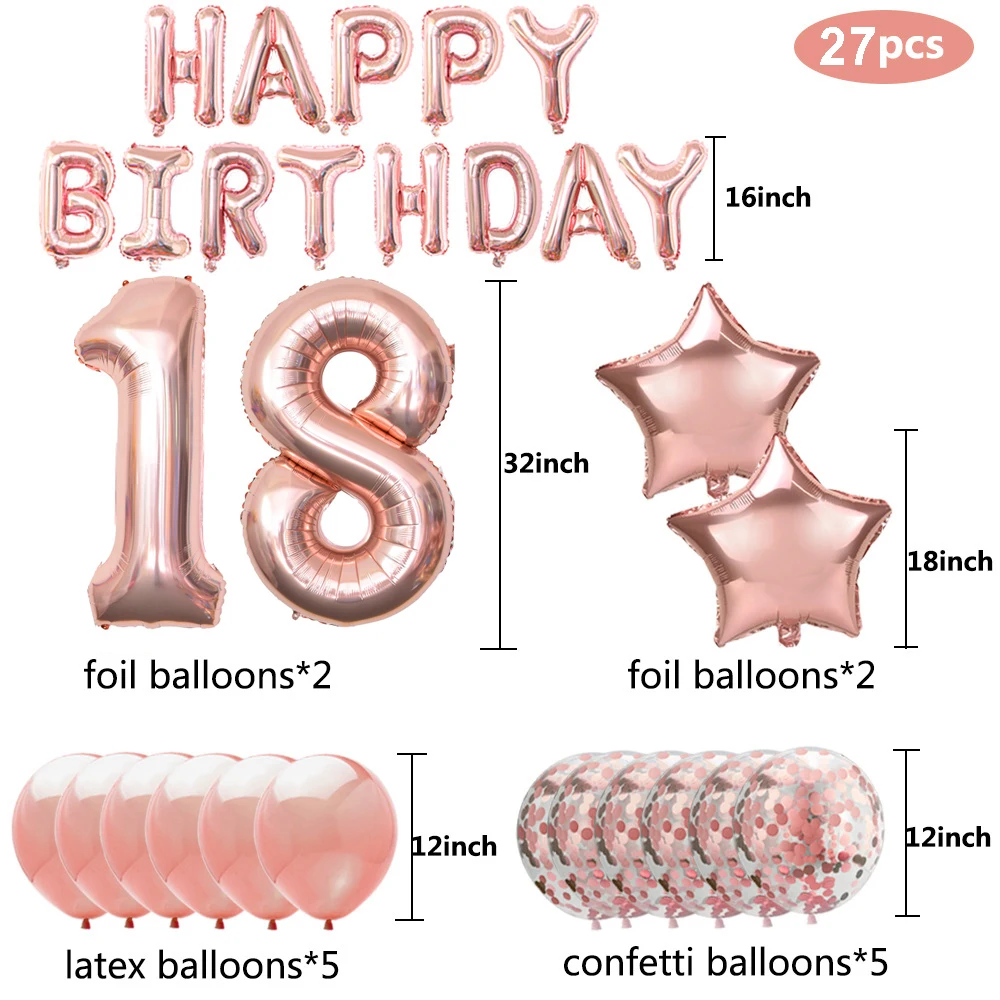 27 шт. посылка: 13 шт. 16 дюймов баннер на день рождения + 10 шт. 12 дюймов латексные шары (5 шт. латексные шары + 5 шт. конфетти шары) + 2 шт. 18 дюймов, украшение в виде звезд, Фольга воздушные шары + 2 шт. 32 дюймов номер Фольга воздушные шары
