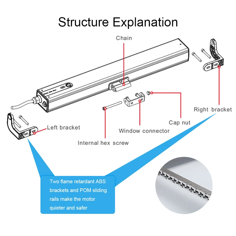 -Стандартный двигатель, DC24V управляется проводным переключателем или проводным контроллером с DC24V-Регулируемая длина стрейч 100-400 мм.-Подходит для окон размером 470 мм.-Долговечность, срок службы более 10000 раз открываются и закрываются.-Двухслойная цепь из нержавеющей стали, работает плавно.-Два огнестойких держателя из АБС-пластика и направляющая для скольжения POM делают двигатель более тихим и безопасным.-Легко устанавливается и снимается.
