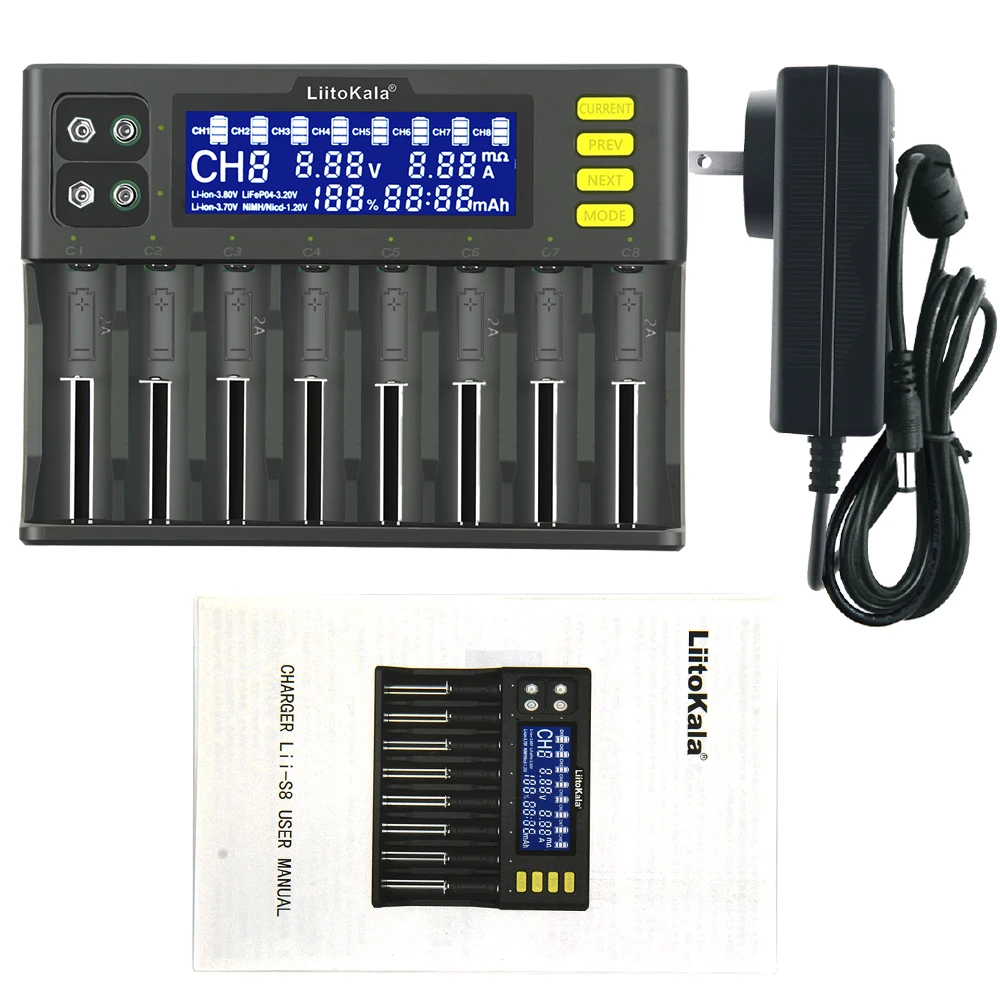 Зарядное устройство LiitoKala Lii-S8, 8слотов, с ЖК-дисплеем, для литийионных, никель-металлогидридных, литий-железо-фосфатных, никель-кадмиевых аккумуляторов 9В, 21700, 20700, 26650, 18650, RCR123, 18700