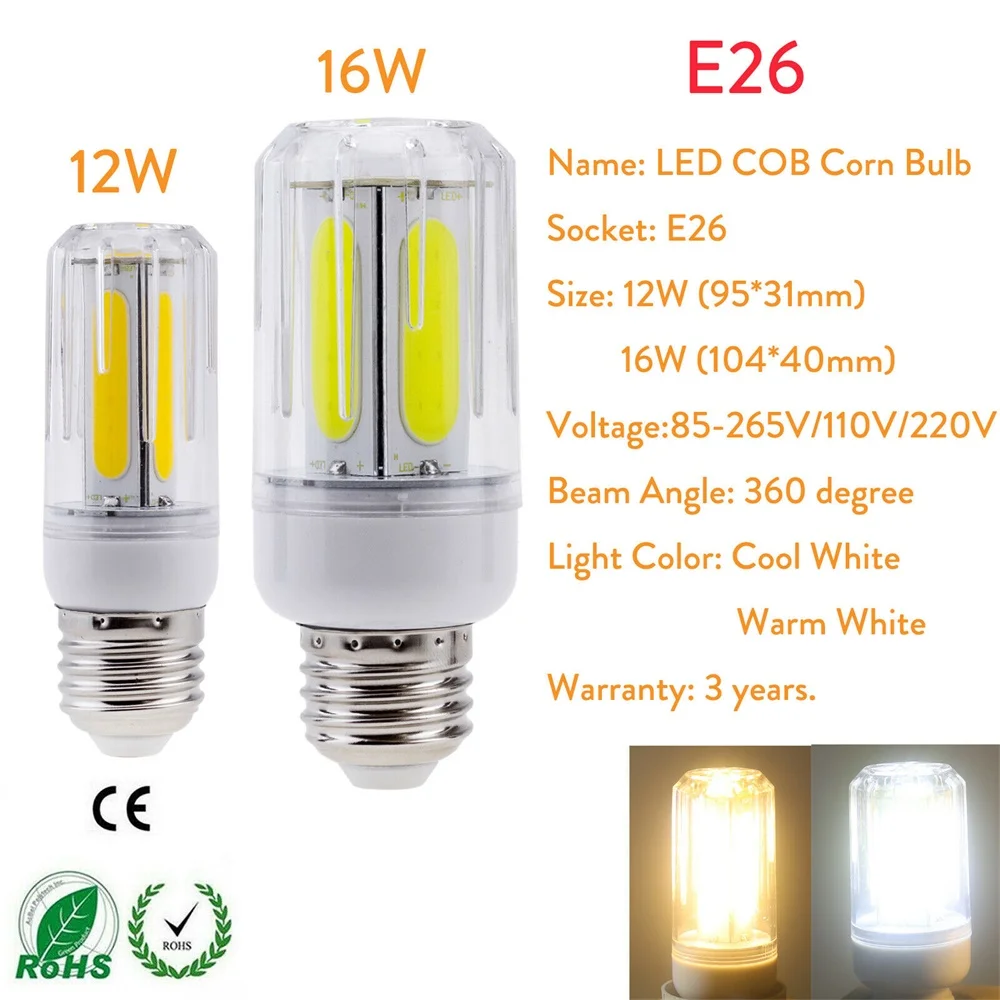 Модель: COB светодиодный BulbsBase Тип: E27,E26,E14,E12, b22 Мощность: 12 Вт/16 Вт Напряжение: 85-265 в (100 в 110 в 120 в 130 в 220 в 230 в 240 В) Люмен: 550-700 лмцветная температура: Дневной свет (холодный белый): 6000-6500 к; мягкий белый (теплый белый): 2700-3200kCRI: >75 срок службы: более 50000 HrsCertification: CE & rohsгарантия: 3 года