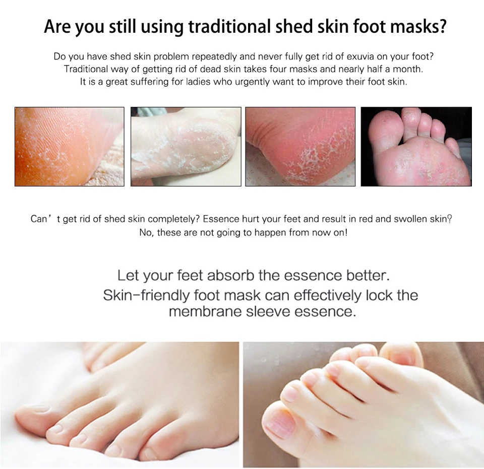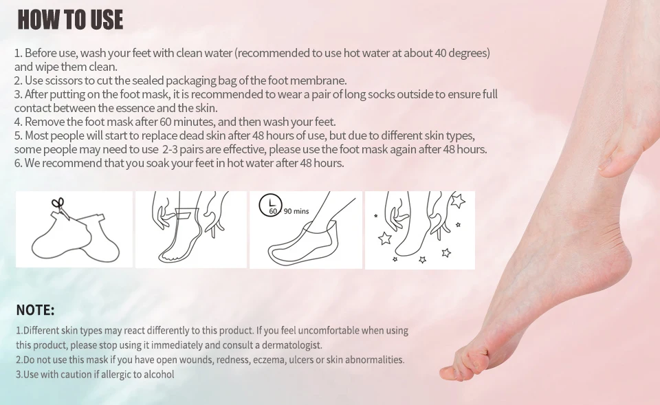 1. Перед использованием промойте ноги чистой водой (рекомендуется использовать горячую воду при температуре около 40 градусов) и протрите их чистой.2. Используйте ножницы, чтобы разрезать герметичный упаковочный пакет для ножной мембраны.3. После надевания маски на стопу рекомендуется носить пару длинных носков снаружи для полного контакта между эссенцией и кожей.4. Снимите маску для ног через 60 минут, а затем Вымойте ноги.5. Большинство людей начнут заменять омертвевшую кожу после 48 часов использования, но из-за различных типов кожи некоторым людям может потребоваться использовать 2-3 пары, пожалуйста, используйте маску для ног снова через 48 часов.6. Мы рекомендуем замочить ноги в горячей воде через 48 часов.