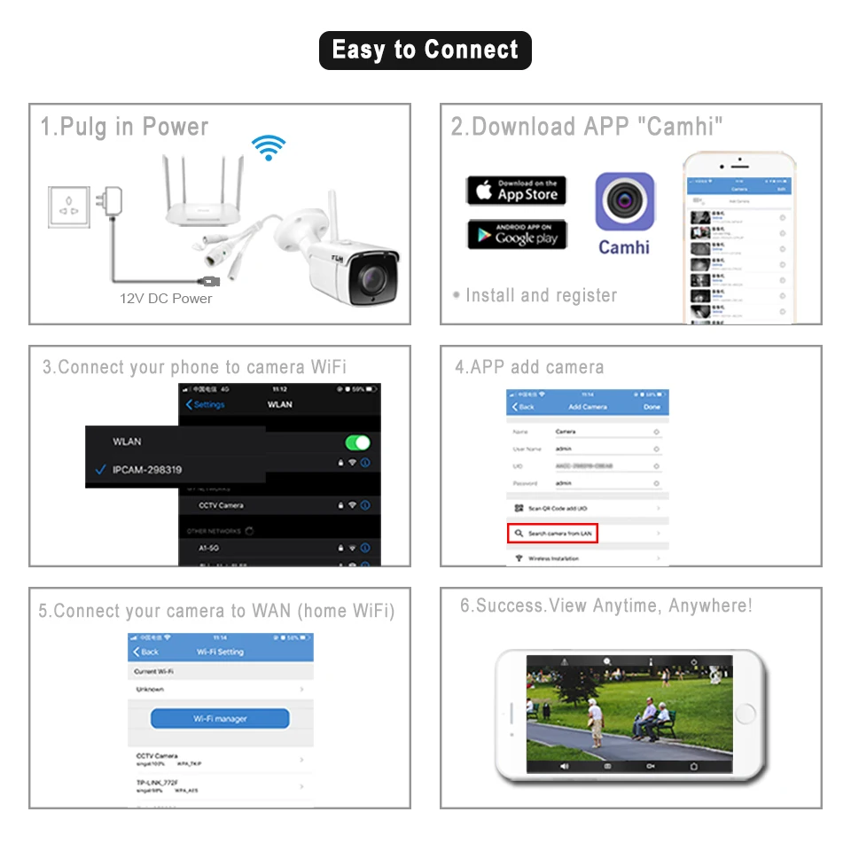 1. Подключите питание.2. Загрузите приложение «Camhi».3. Подключите телефон к Wi-Fi камере.4. Приложение добавляет камеру5. Подключите камеру к WAN (домашний Wi-Fi)6. Успех. Просмотр в любое время и в любом месте!