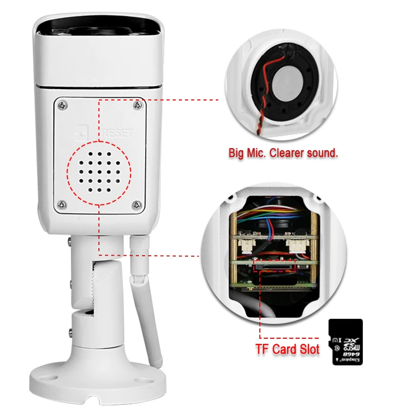 Мощный встроенный микрофон и динамик. Вы можете связаться с кем угодно под камерой наблюдения через смартфон, ipad или компьютер.