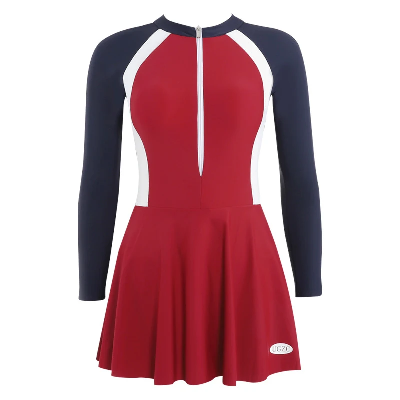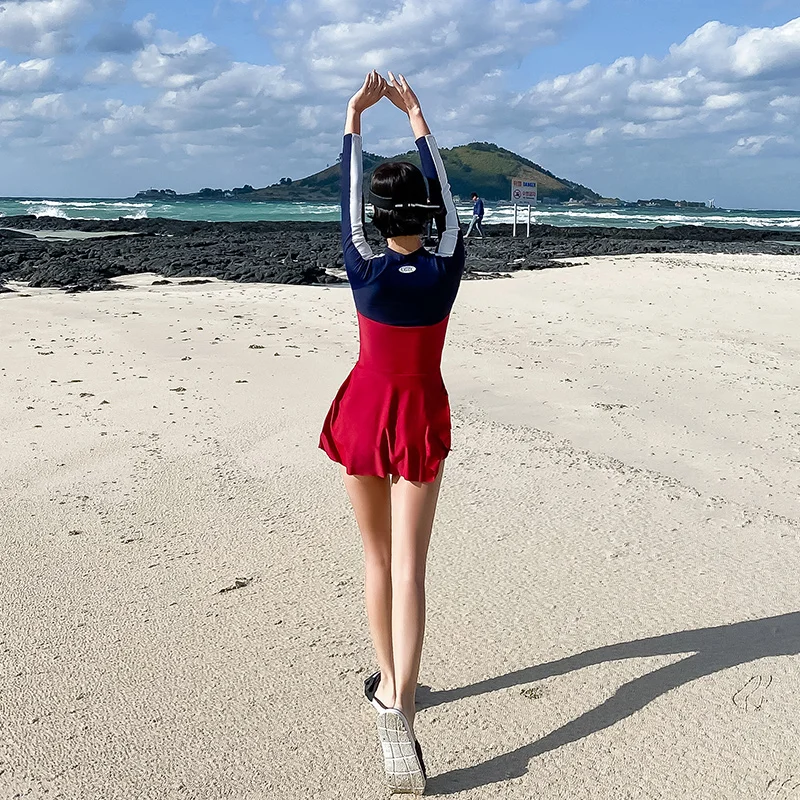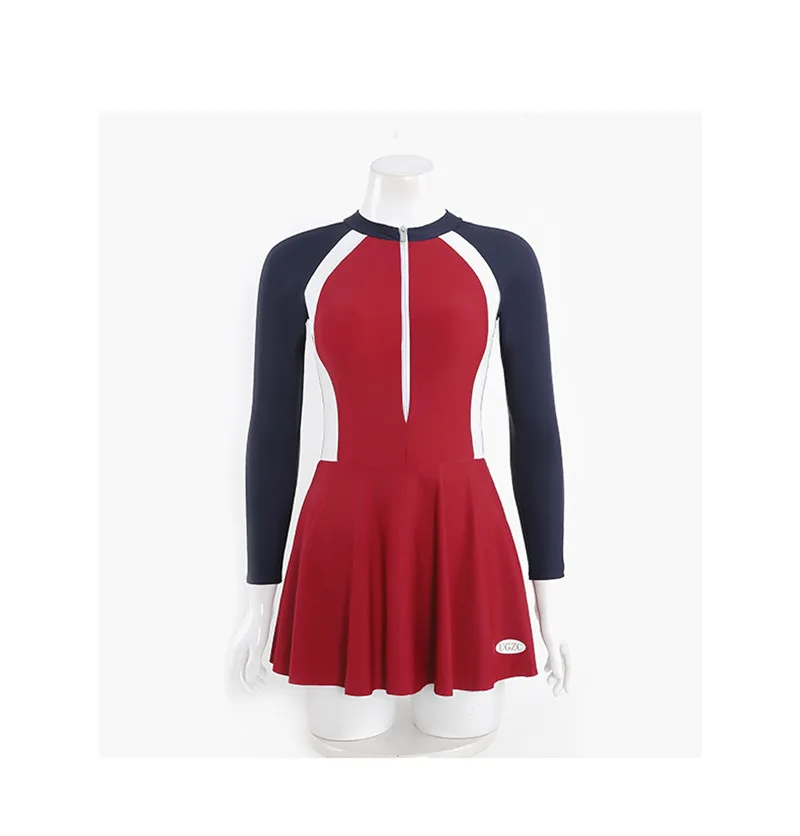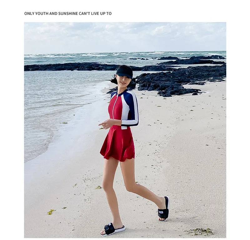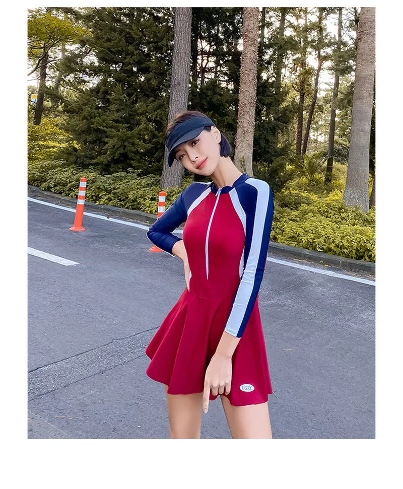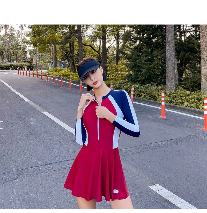 Женская одежда для плавания, юбка с защитой от сыпи, цельная Корейская Спортивная одежда для плавания, короткое платье для плавания с длинным рукавом, Женская Солнцезащитная одежда на молнии
