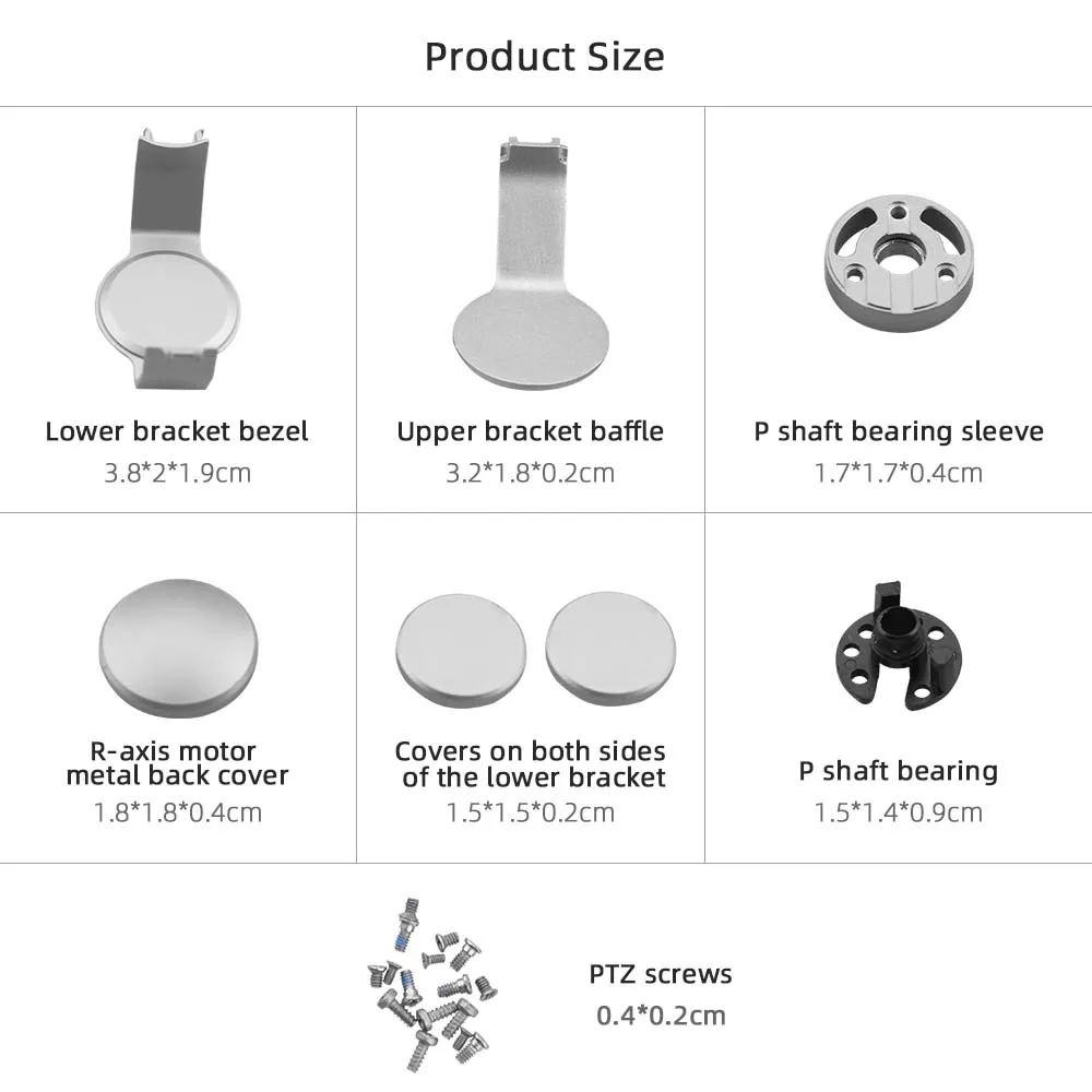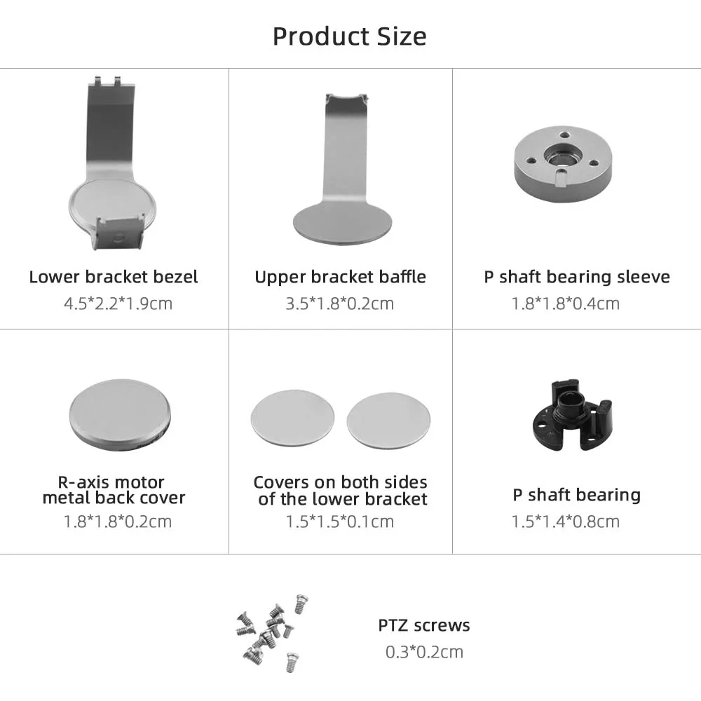 1 шт. Нижний Кронштейн дефлектор, 1 шт. верхний кронштейн дефлектор, 2 шт. крышки пластин с обеих сторон нижнего кронштейна, 1 шт. R-axis моторный металлический задний кожух, 1 шт. подшипник оси, 1 шт P-подшипник оси рукав, 12 шт PTZ винт