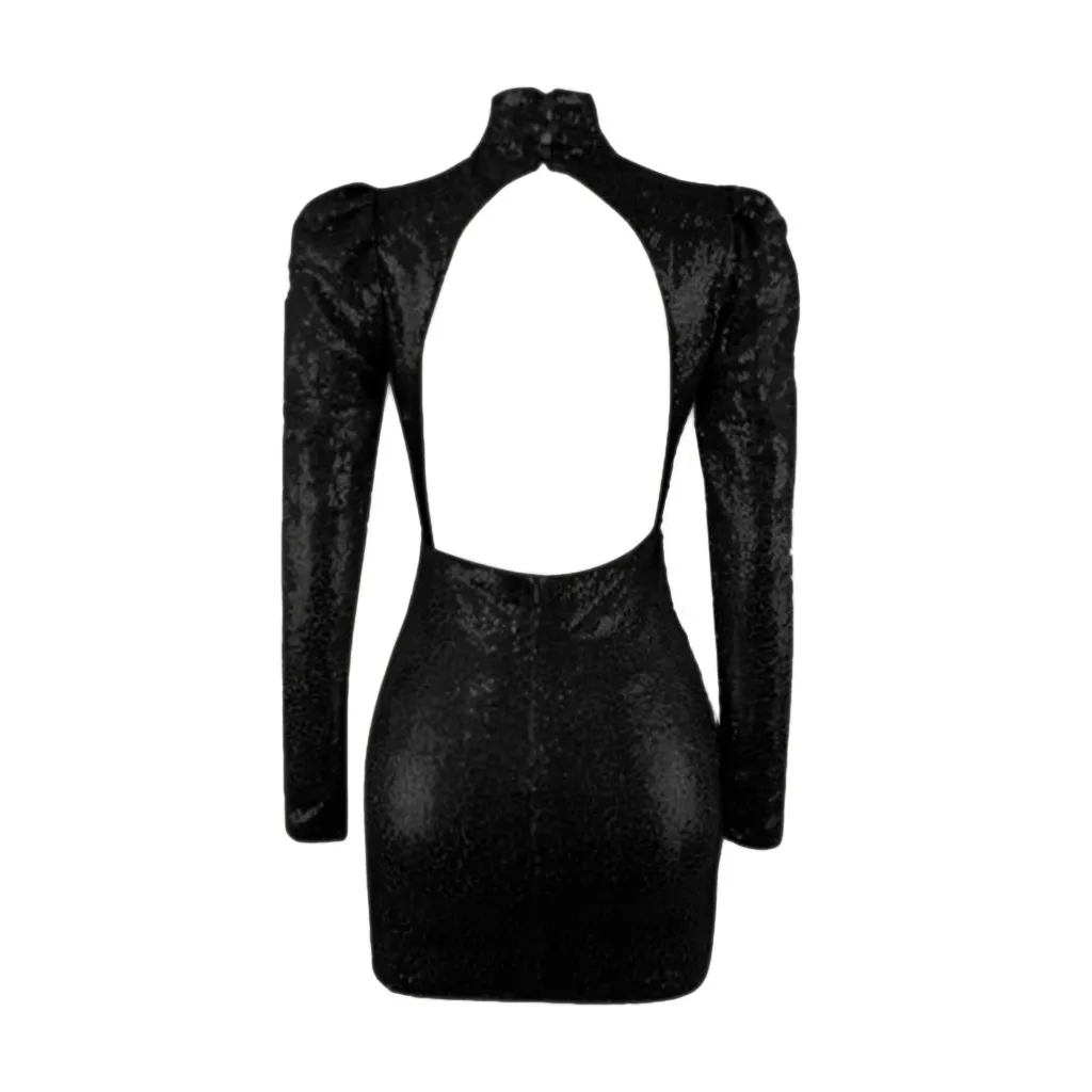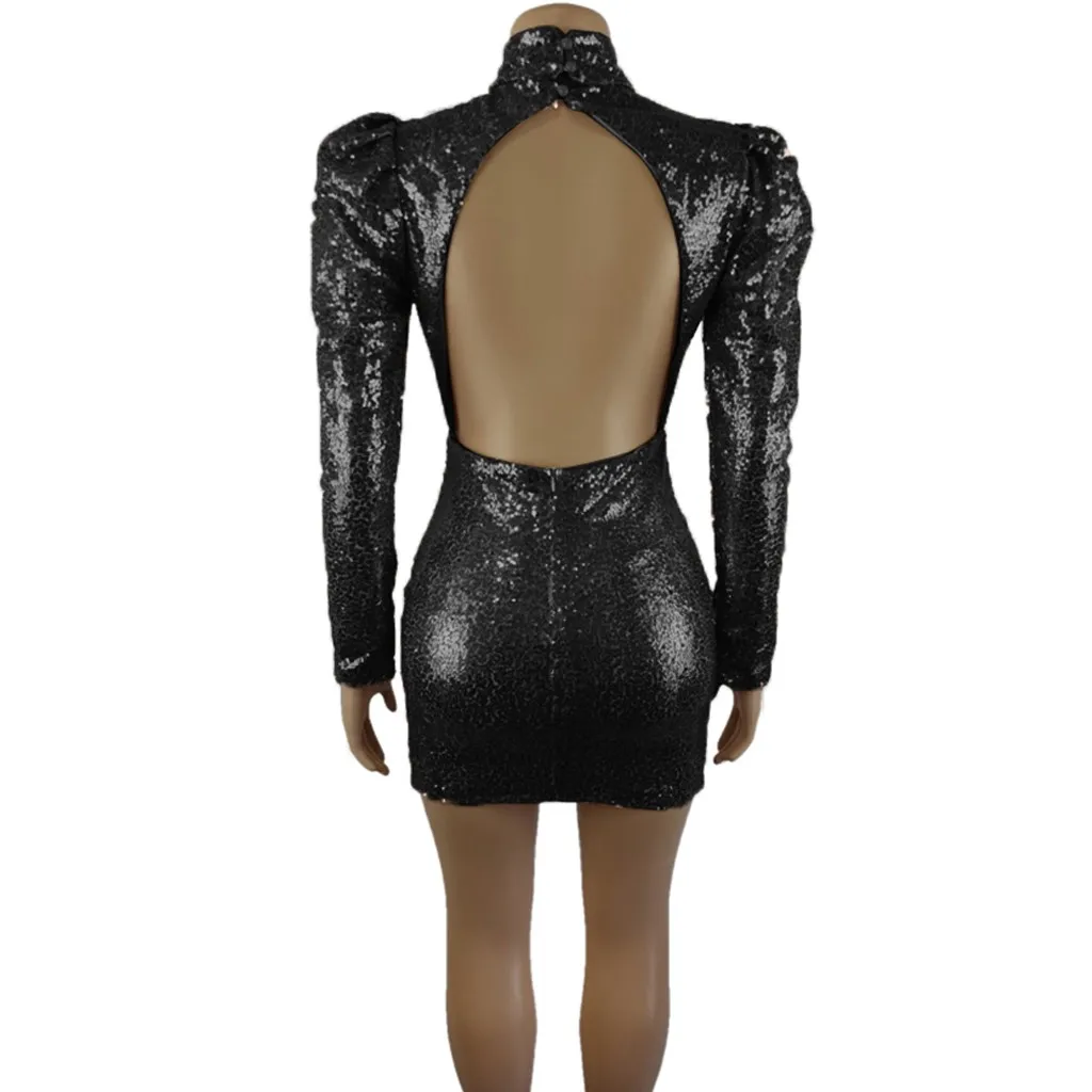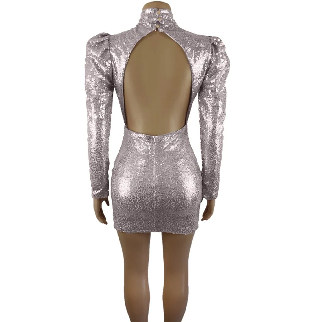 Женское модное однотонное мини-платье с блестками, с длинным рукавом, с открытой спиной, вечерние платья