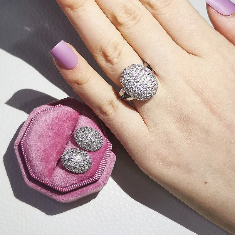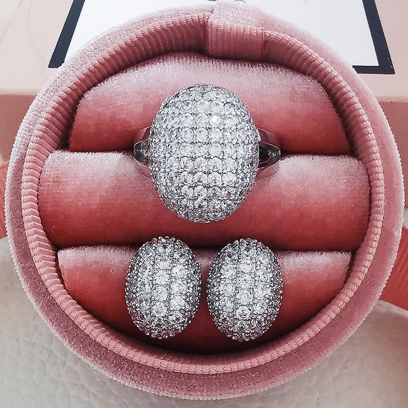 Комплект ювелирных украшений для невесты, комплект из 2 круглых сережек-гвоздиков серебристого цвета, обручальное кольцо с ореолом, подарок на свадьбу, Рождество, вечеринку, J6016
