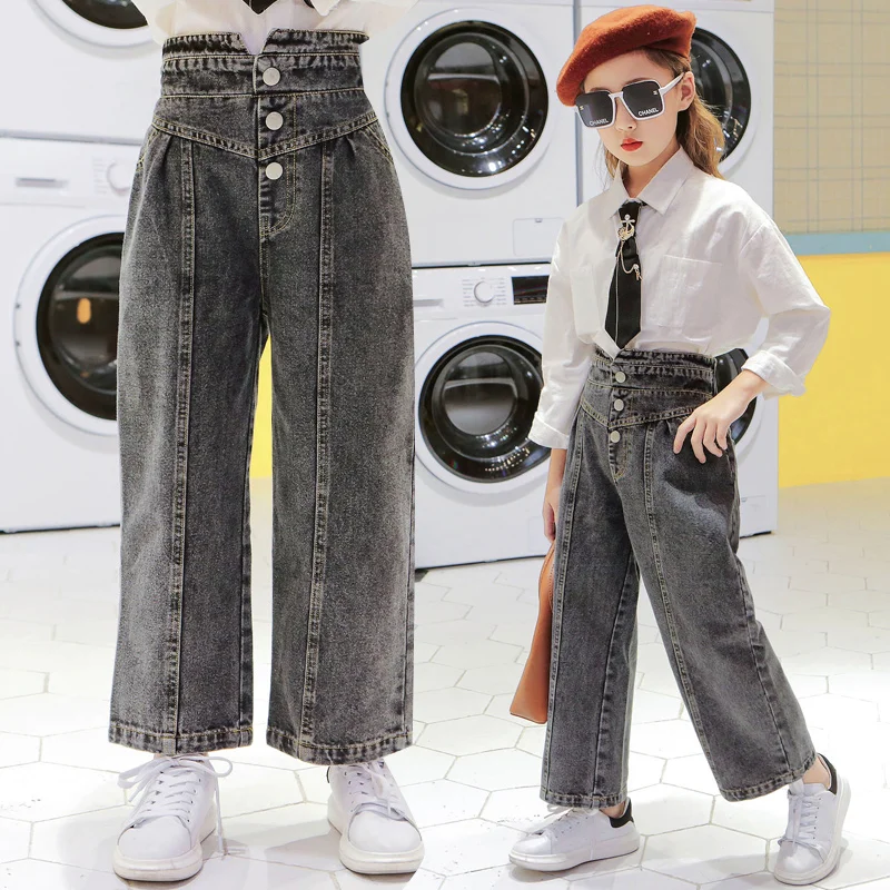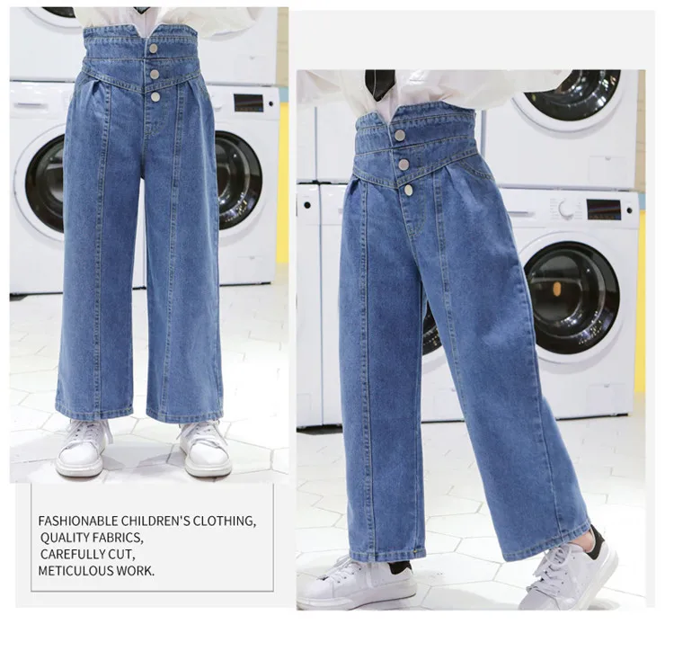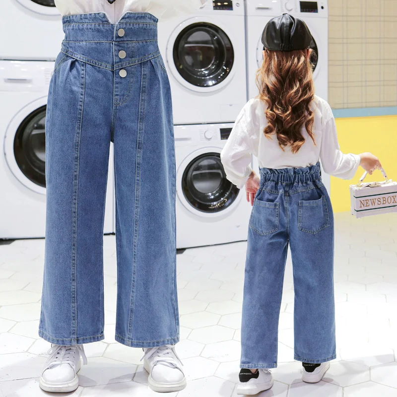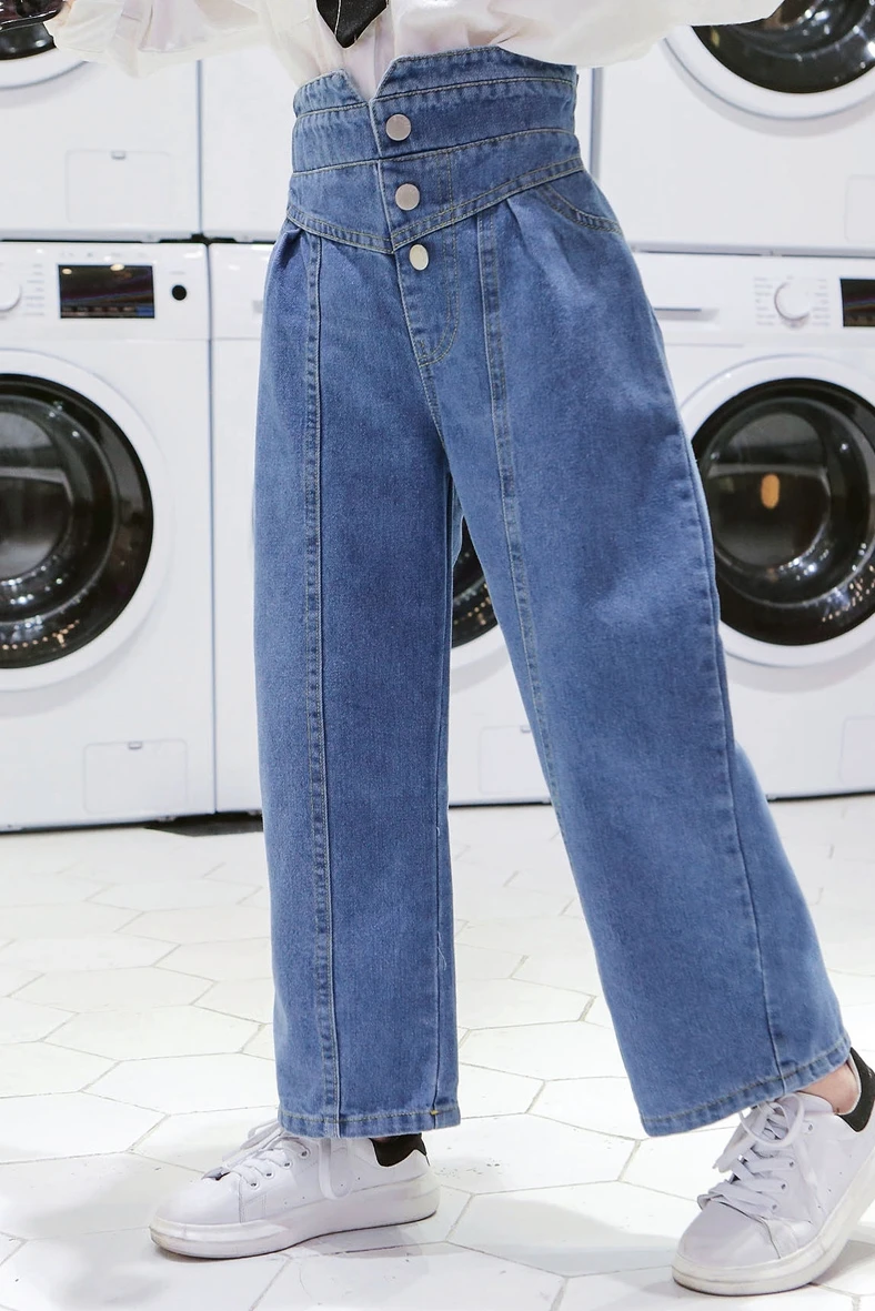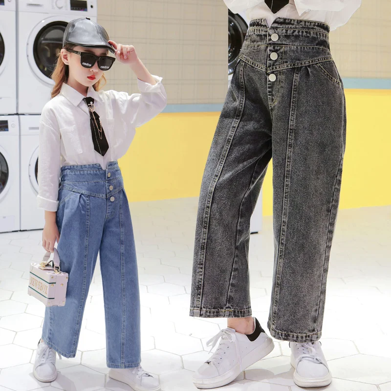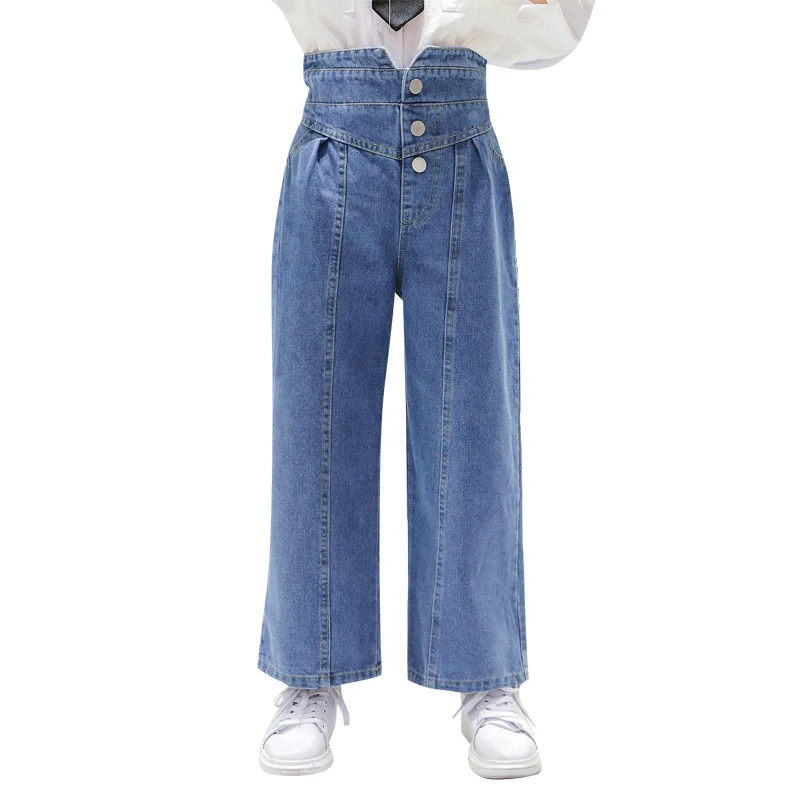 Джинсы для девочек, детские джинсовые штаны, детские брюки с широкими штанинами, уличная одежда, прямые штаны с высокой талией и пуговицами, 3-14