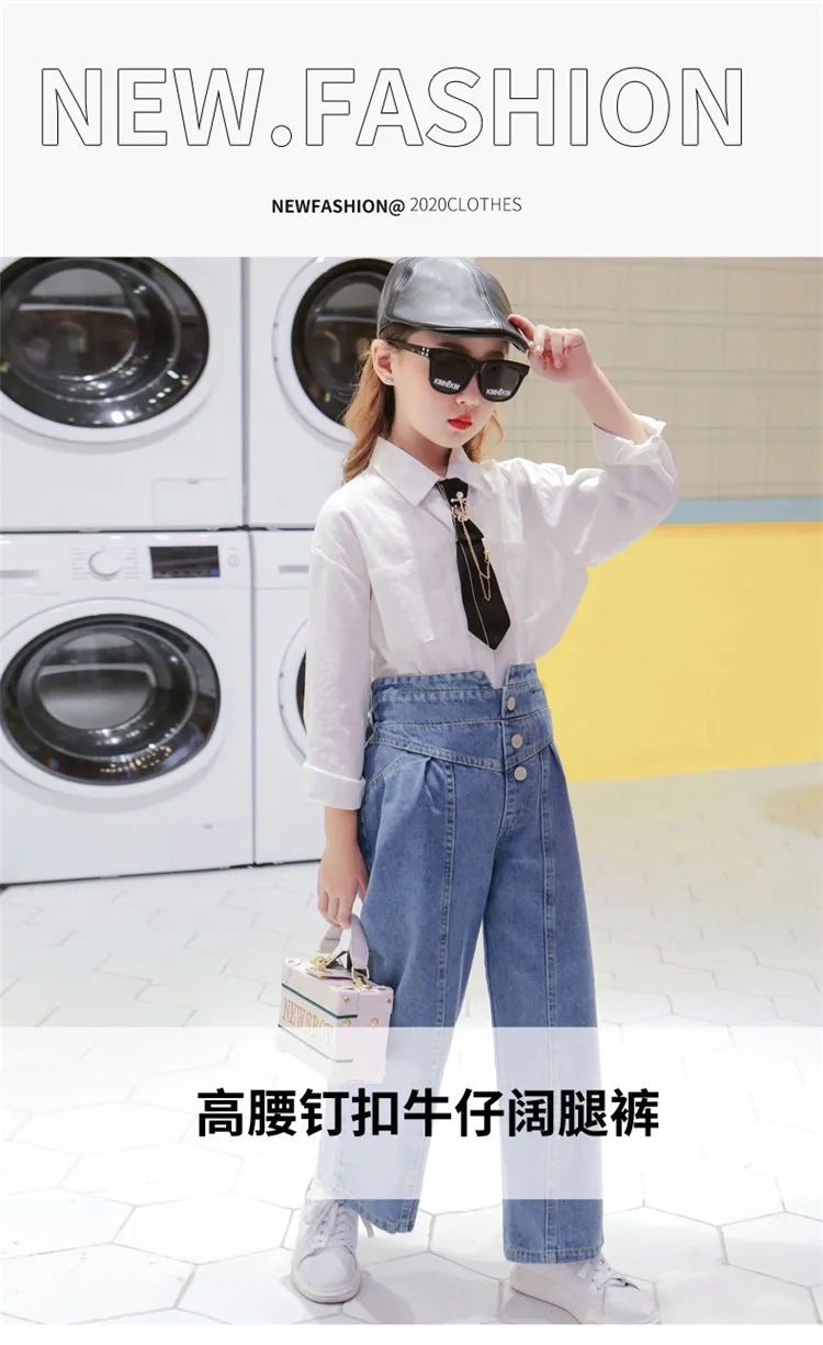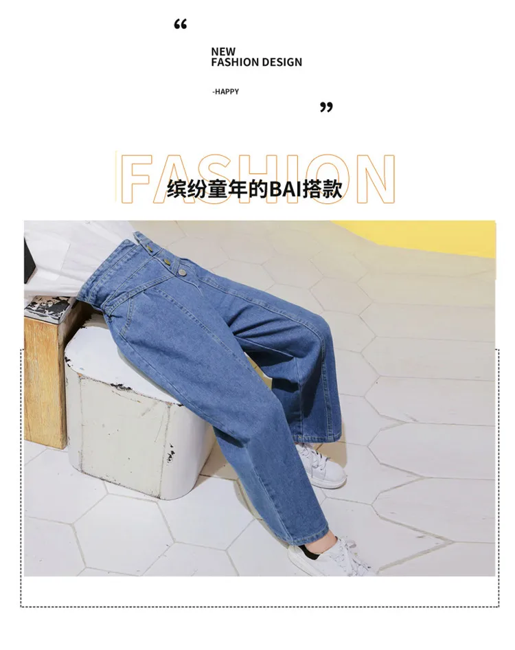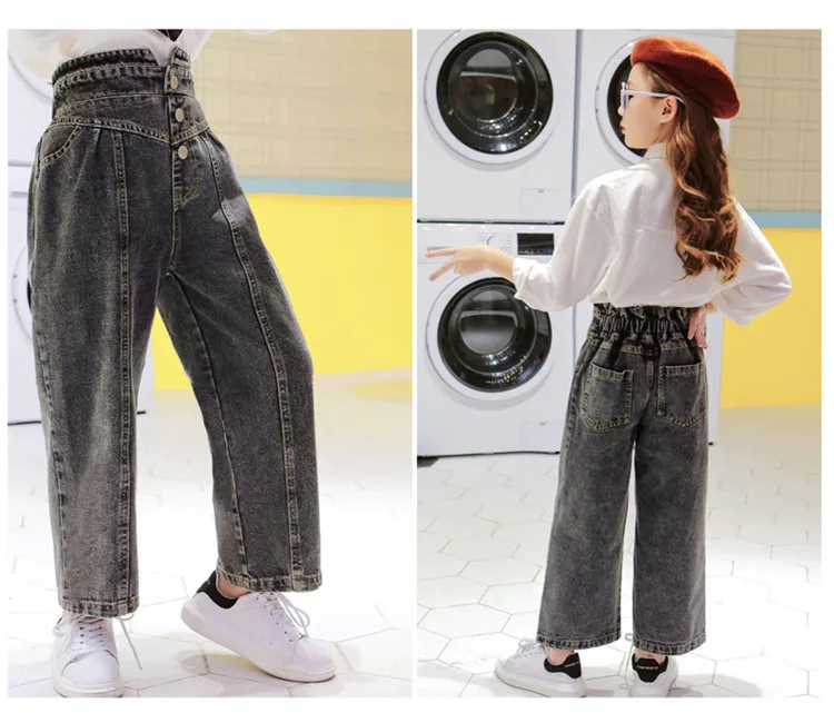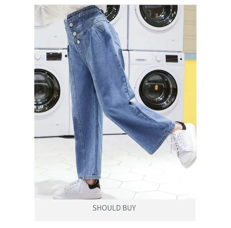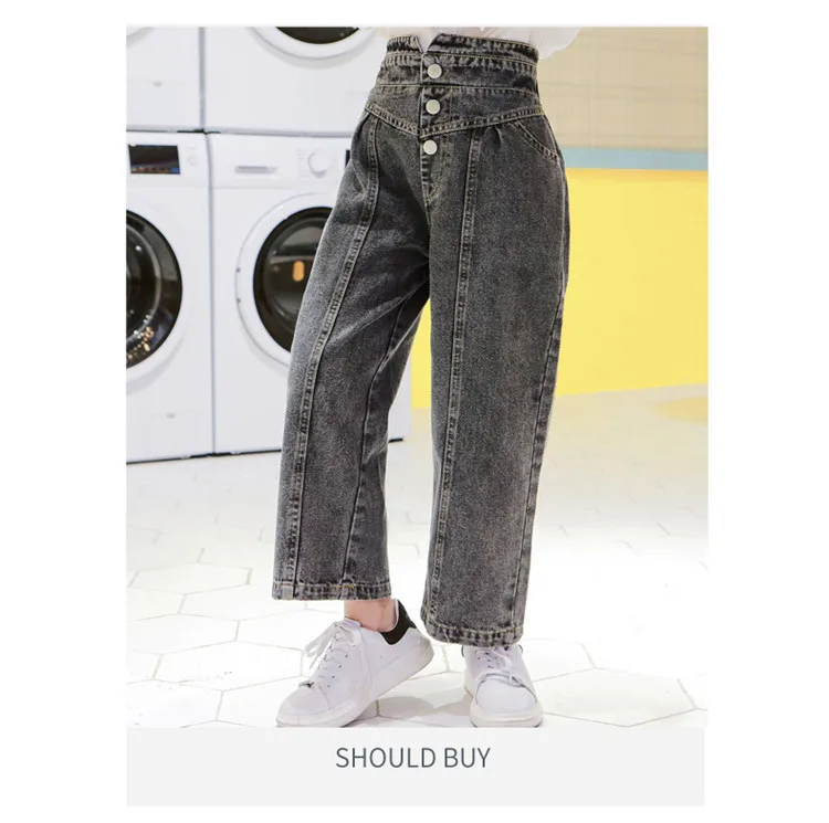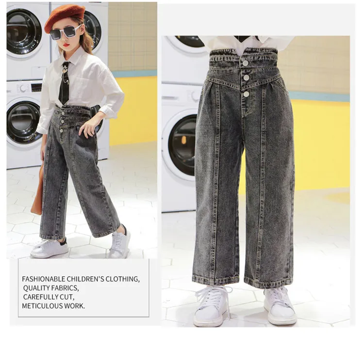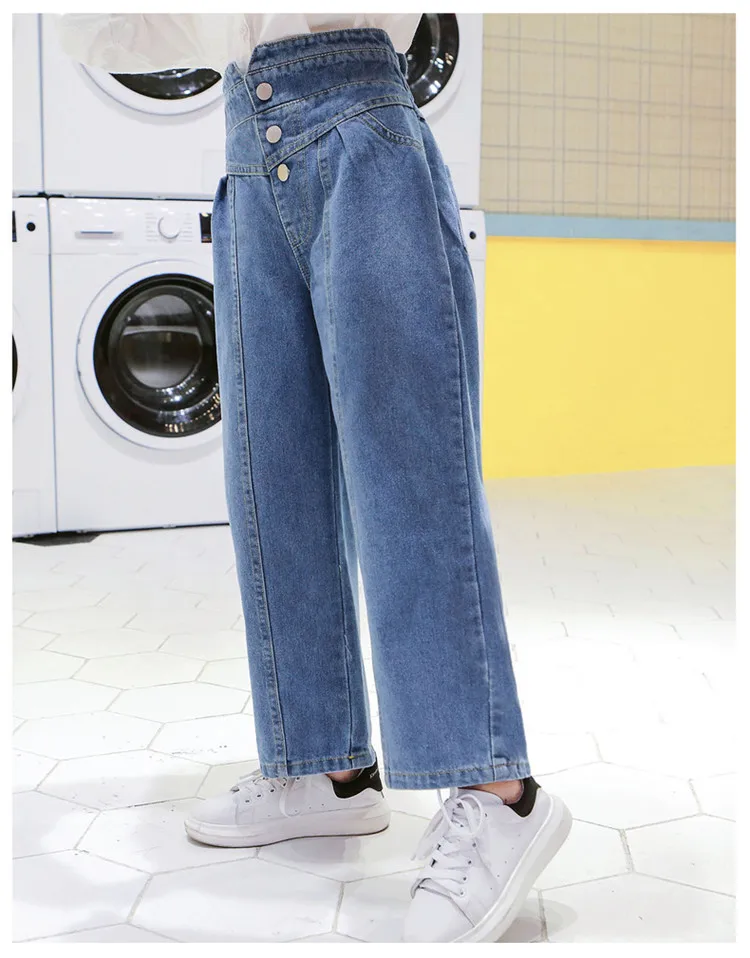 Джинсы для девочек, детские джинсовые штаны, детские брюки с широкими штанинами, уличная одежда, прямые штаны с высокой талией и пуговицами, 3-14