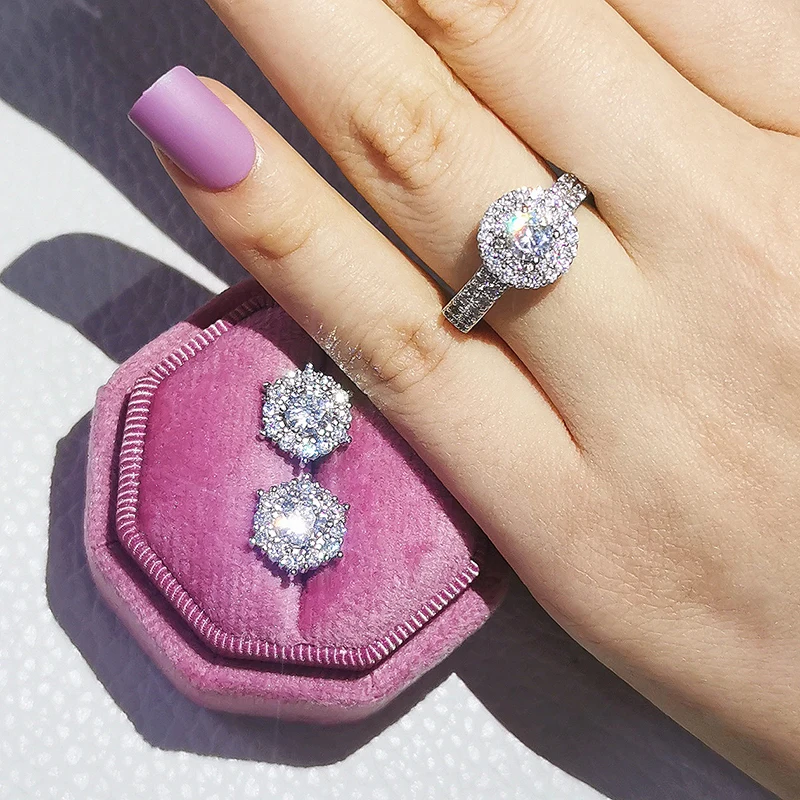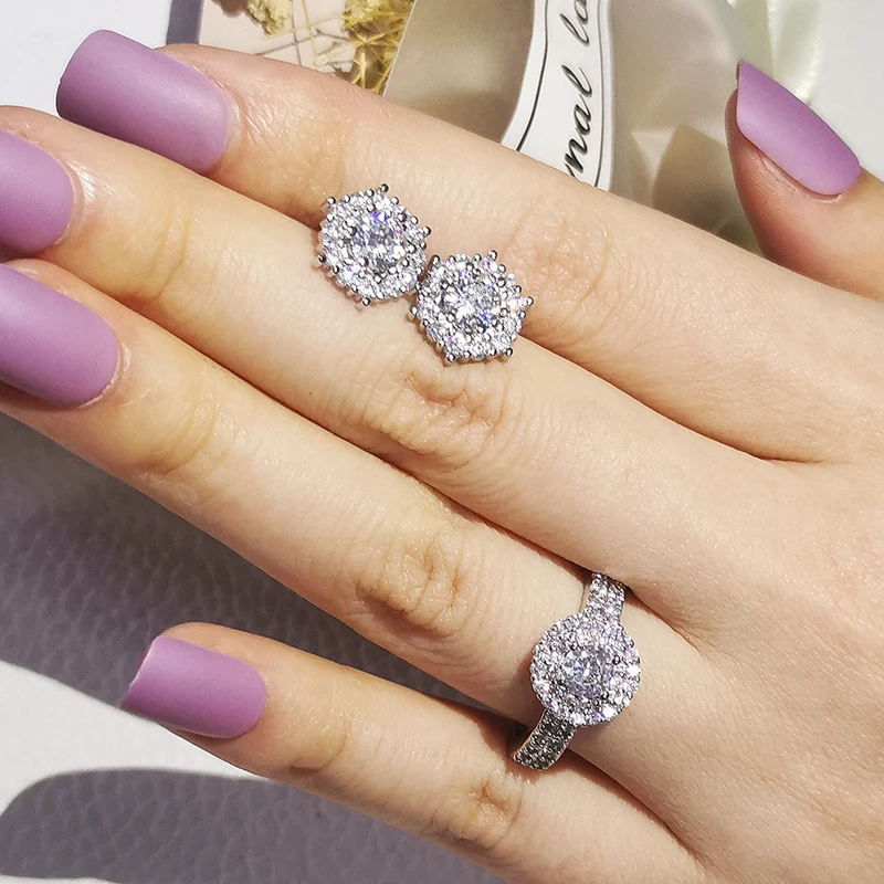 Комплект ювелирных изделий для невесты, круглые серьги-гвоздики с ореолом, серебристого цвета, обручальное кольцо, свадебный подарок, 2 шт.упаковка, J6018
