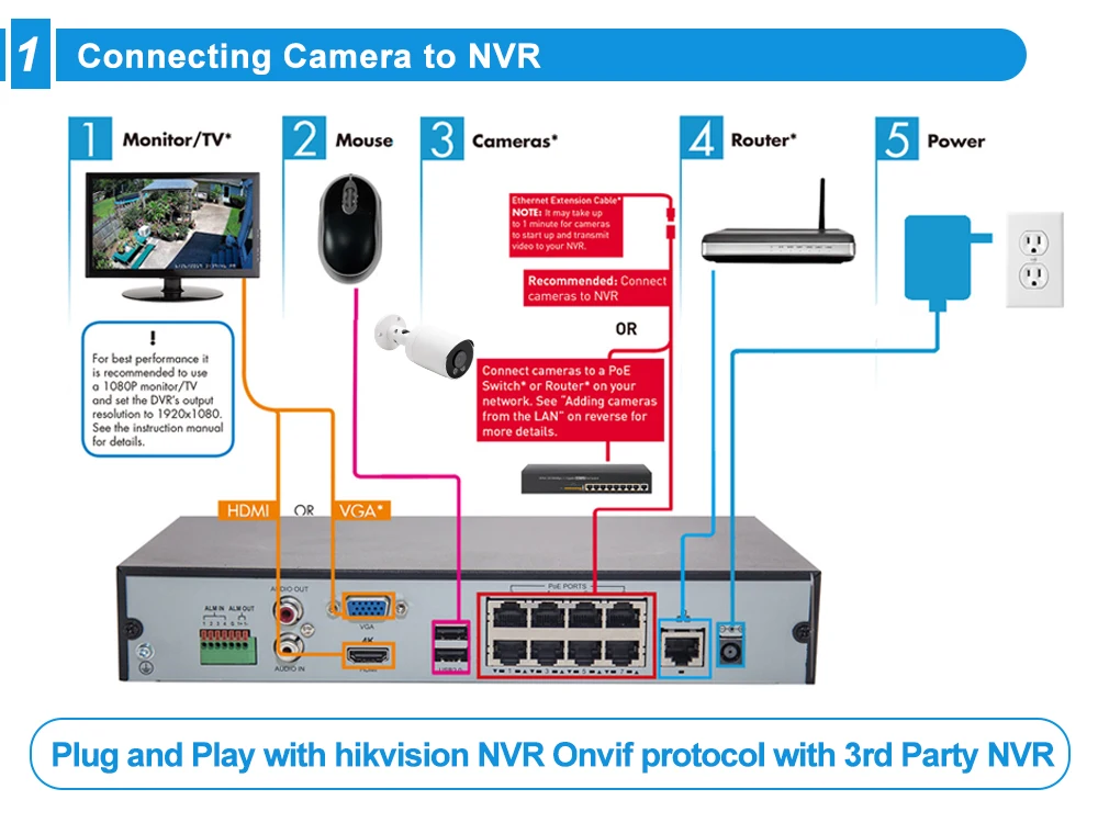 Настоящая система безопасности plug and play! Он оснащен PoE (питание через Ethernet), с одним кабелем, соединяющим каждую ip-камеру с NVR как для источника питания, так и для передачи видеосигнала. Простая Проводка-процесс проводки не может быть проще для любителей DIY и начинающих.