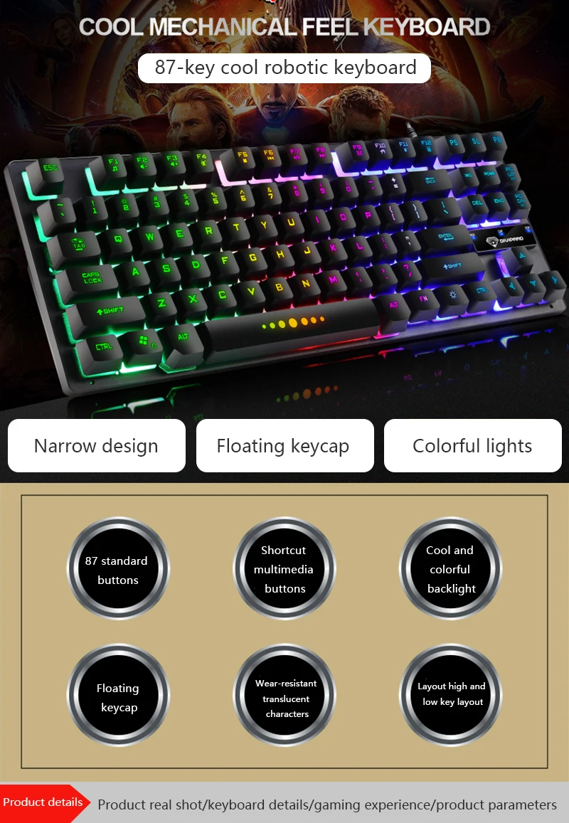 Структура 87-key keycap, принцип светоизлучающий светильник полностью отличается от того, что Лазерная Гравировка Печати keycap, что устраняет проблему износа персонажа и неясного персонажа после использования обычных колпачков с печатным покрытием