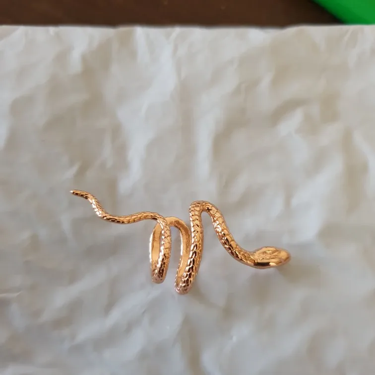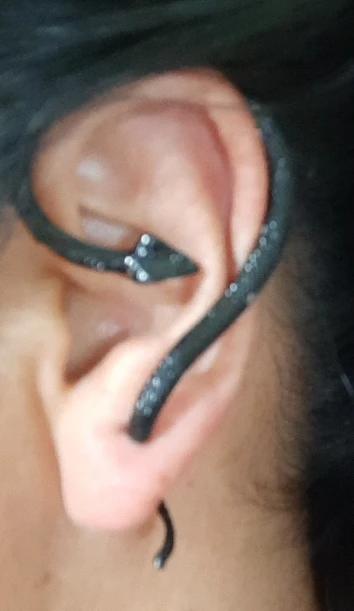 Змейка серебриста с легким чернением. Сидит на ухе вполне удобно. А смотрится ну просто шикарно. Очень довольна.