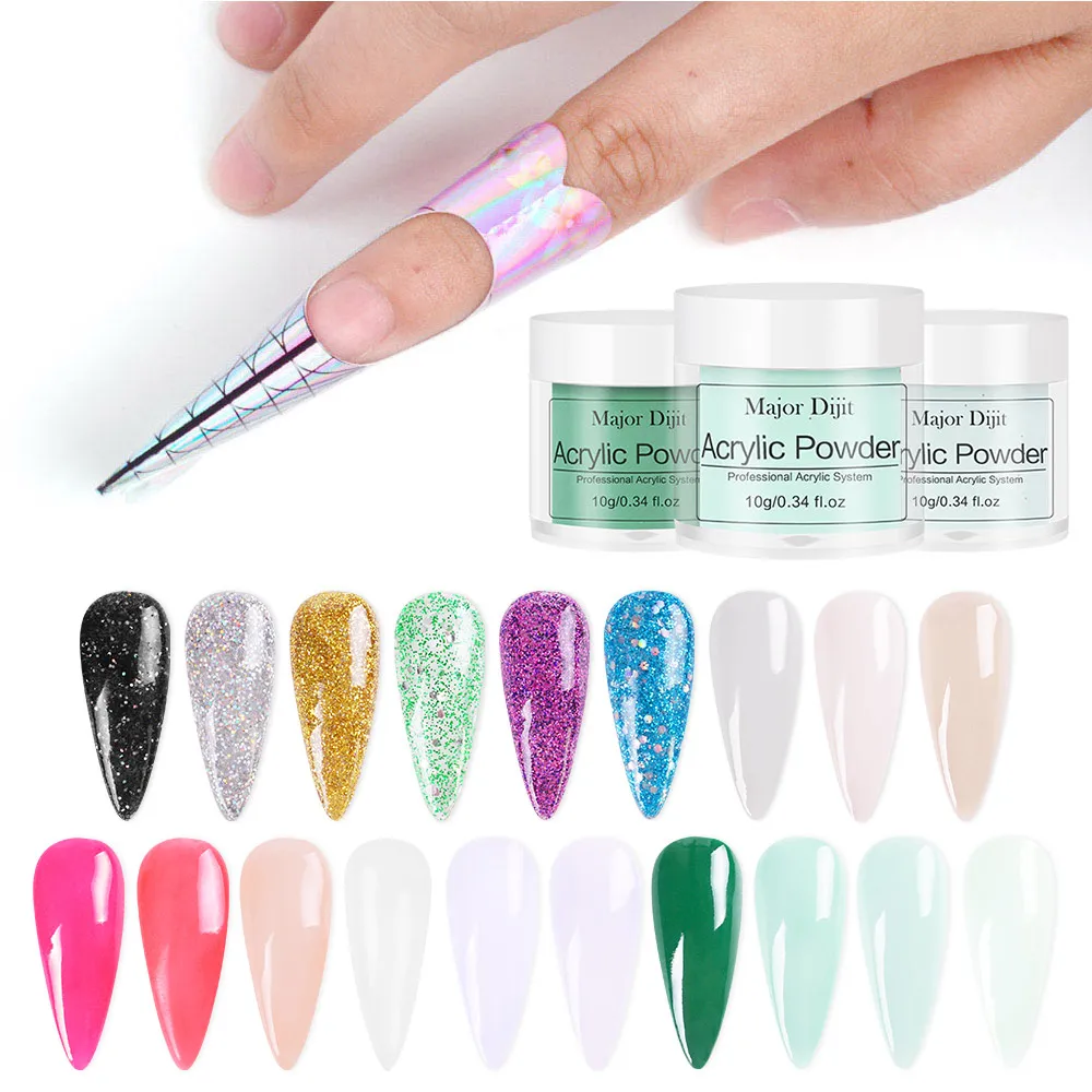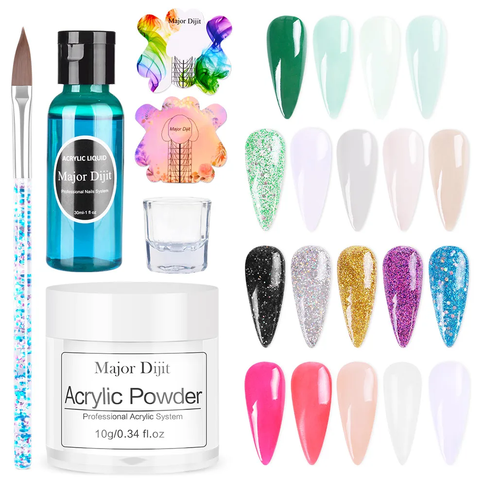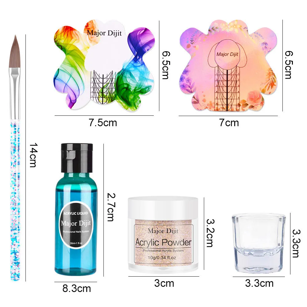 Характеристики изделия: Бренд: Major diit Наименование: набор акриловых систем Вес: 150 г 7 наборов акриловой пудры для ногтей на ваш выбор Используется для: наращивания ногтей и резьбы ногтей В комплекте: акриловая пудра, акриловая жидкость, ручка для резьбы и стеклянный стакан