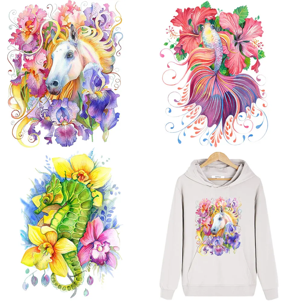 Термонаклейки для одежды, футболок, с принтом животных, цветов, лошадей, рыб