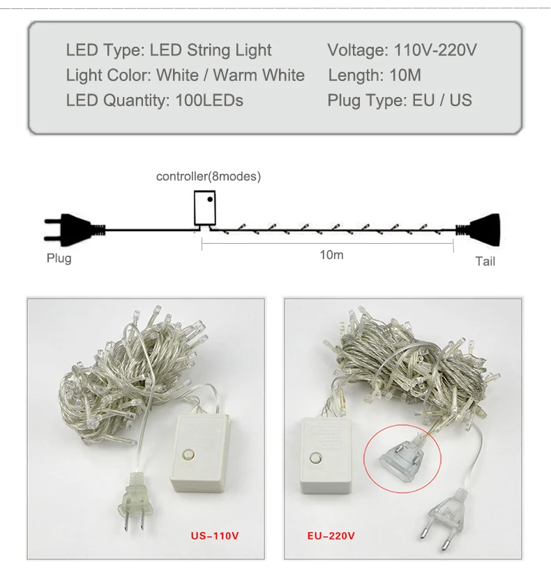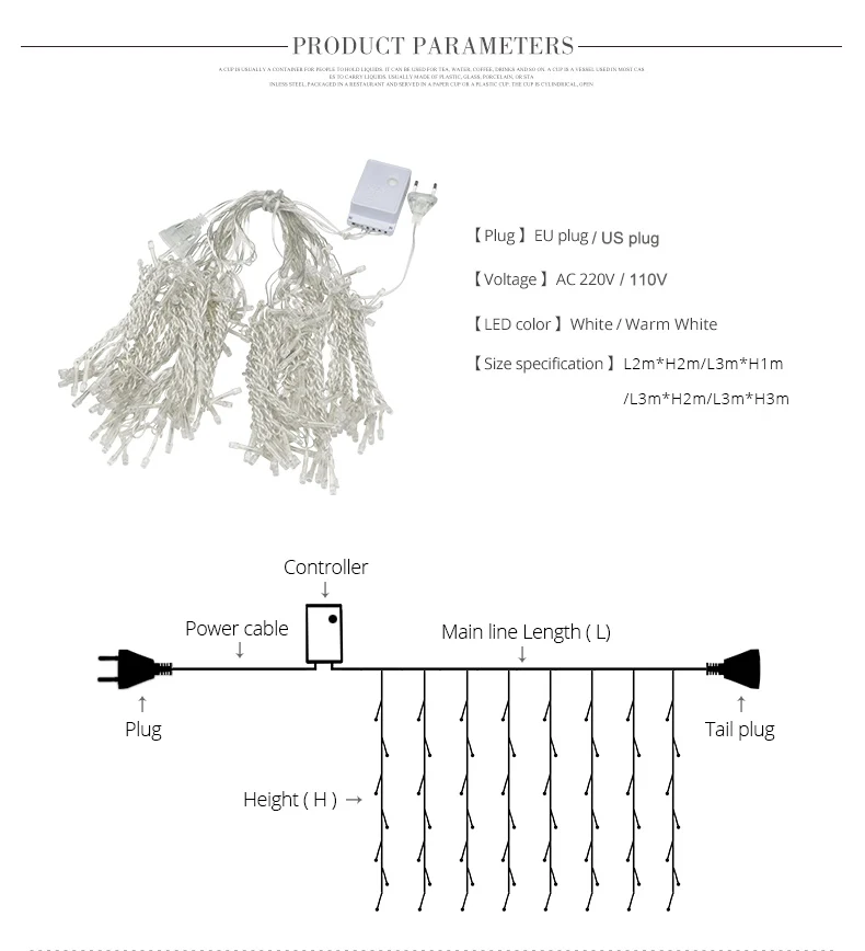 Размер: 1X3M / 2X3M / 3X3M / 2X2M / 10M/2,5 MЦвет: белый/теплый белыйВходное напряжение: 110 В (штепсельная вилка США) / 220 В (штепсельная Вилка европейского стандарта)Контроллер переключателя: 8 видов режимовМедный провод + пластиковая крышка