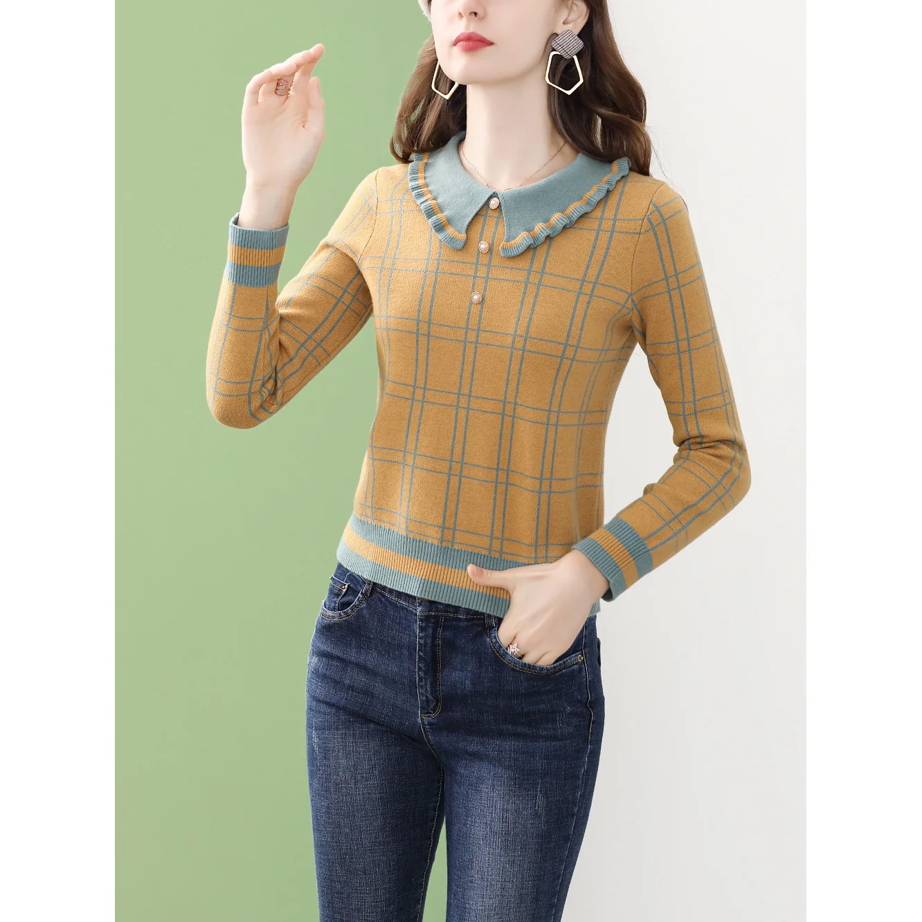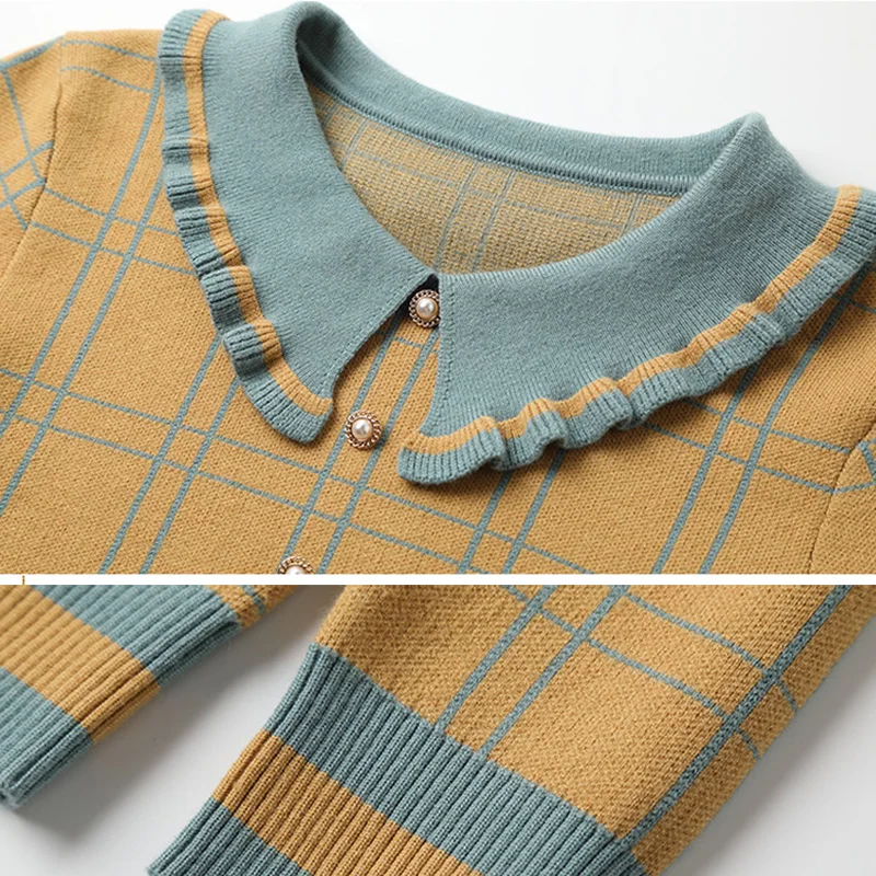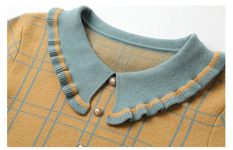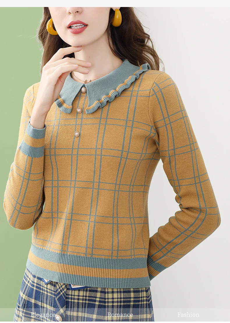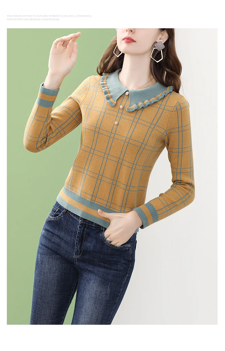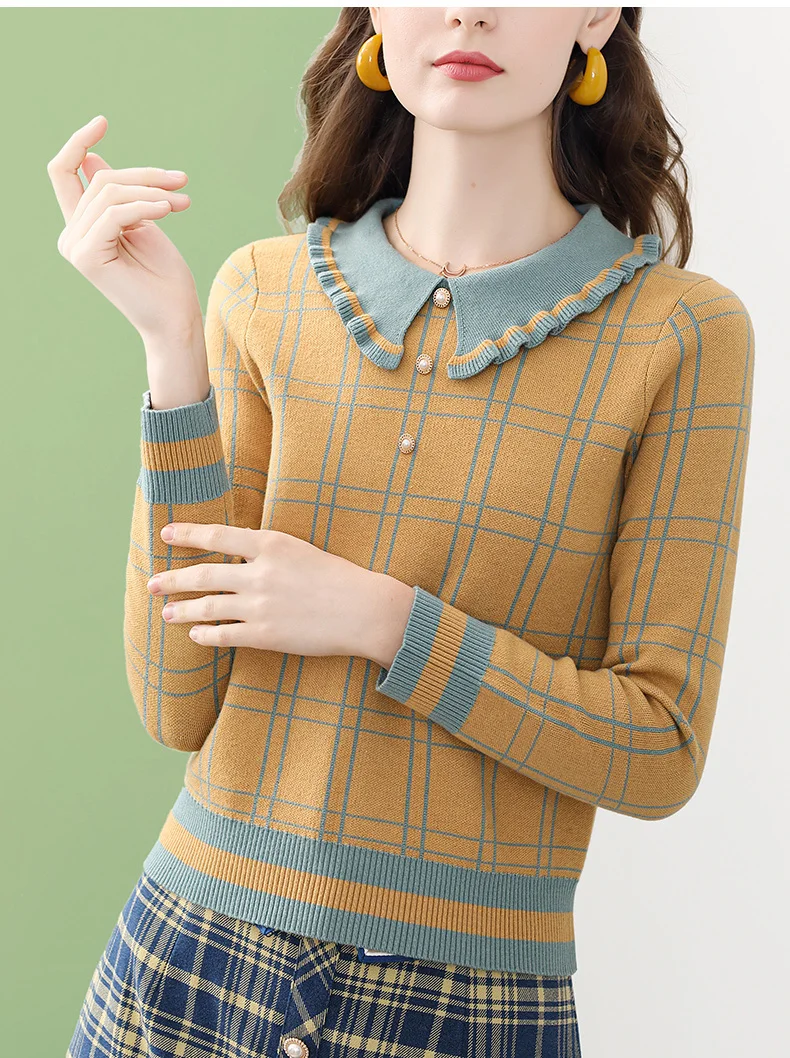 Женская вязаная блузка в клетку ONLY PLUS, желтая повседневная кофта с воротником Питера Пэна и длинными рукавами, Зимний пуловер, уличная одежда, 2021