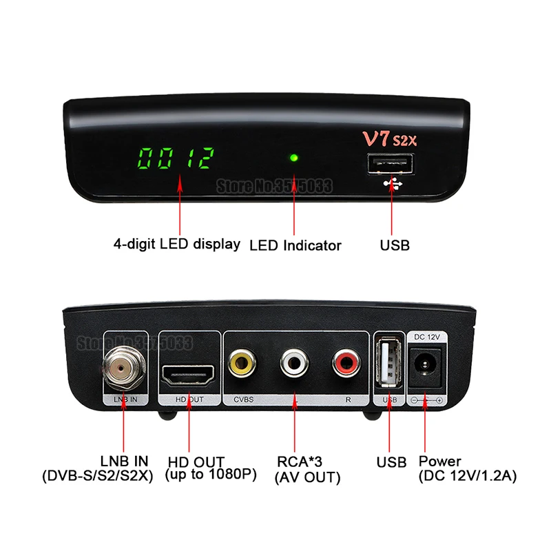 Панель Дисплей 4-разрядный светодиодный дисплейСветодиодный индикатор питания: зеленый; Режим ожидания: красныйКнопка NCWifi Поддержка USB Wifi ключ (MTK7601/RT5370)ИК-выход ИК для 38 кГц, инфракрасный пульт дистанционного управленияЗадняя панель LNB IN (частотный диапазон от 950мгц до 2150 МГц DVB-S/S2/S2X)Выход HD (до 1080P)RCA * 3 (AV OUT)2 * хост USB 2,0Мощность (12 В/1,2 А постоянного тока)