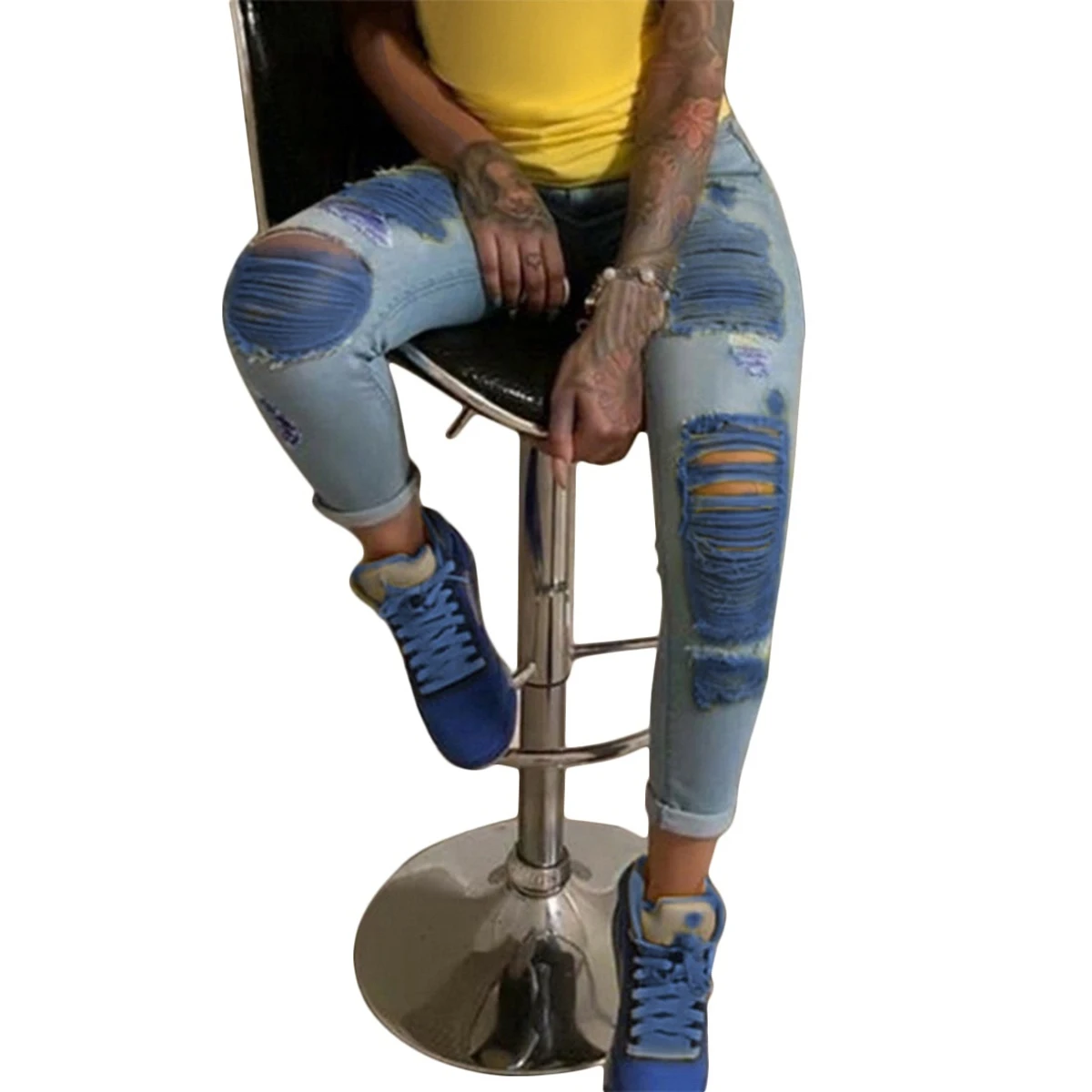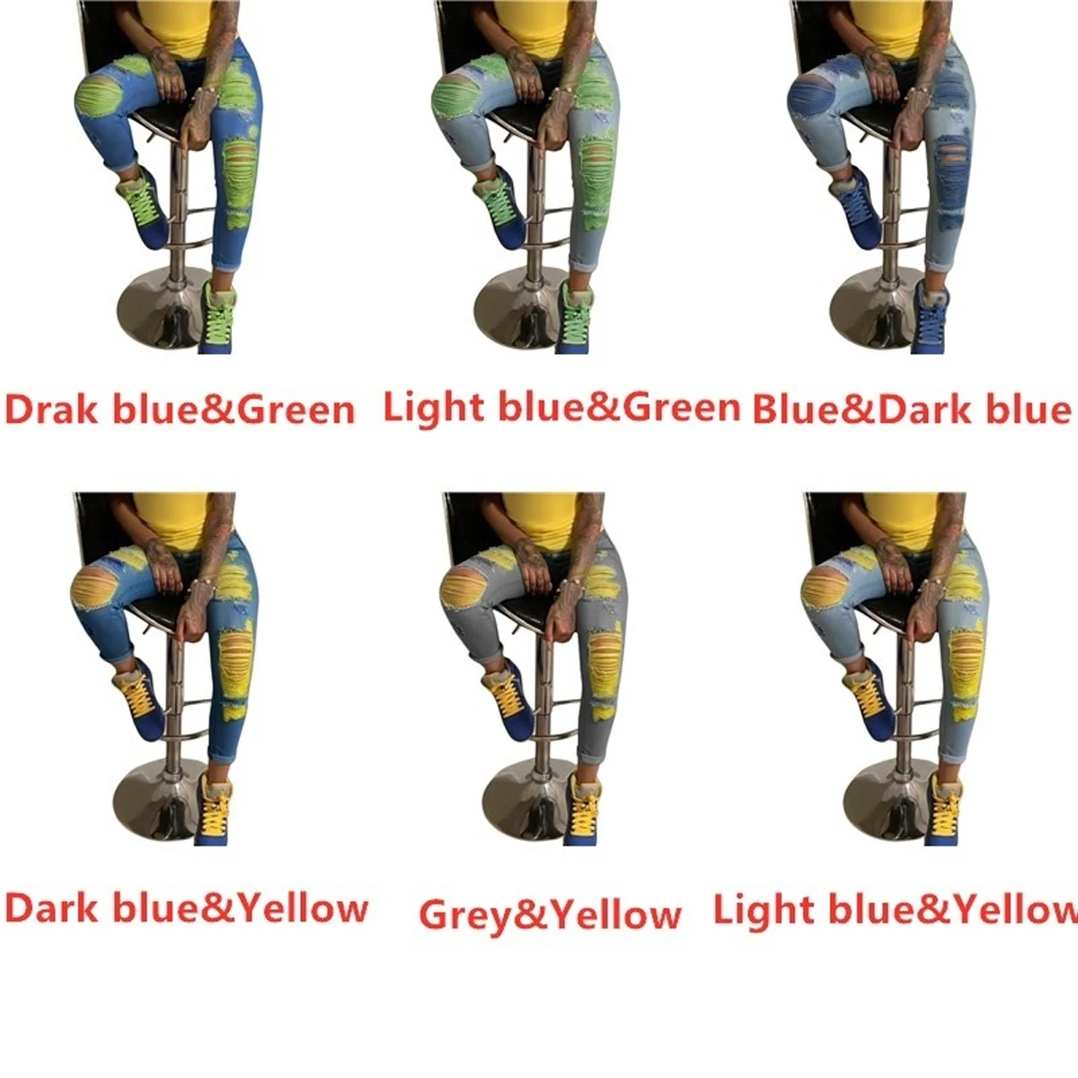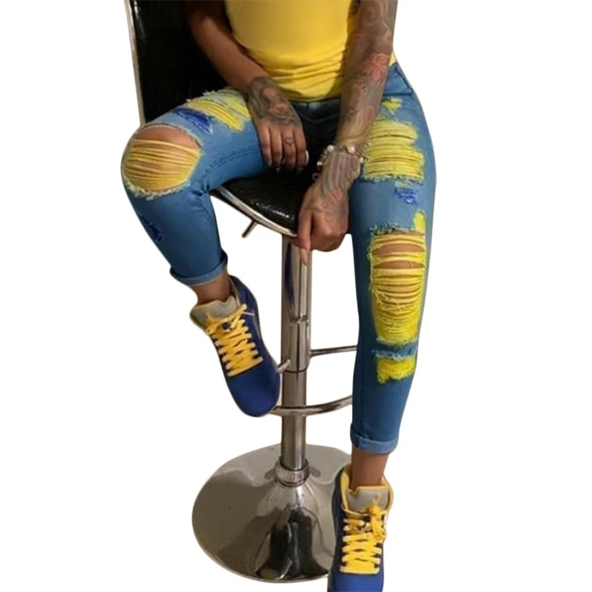 Женские узкие джинсы в Корейском стиле, модные рваные синие джинсовые брюки контрастных цветов с высокой талией и эластичными штанинами, 2021