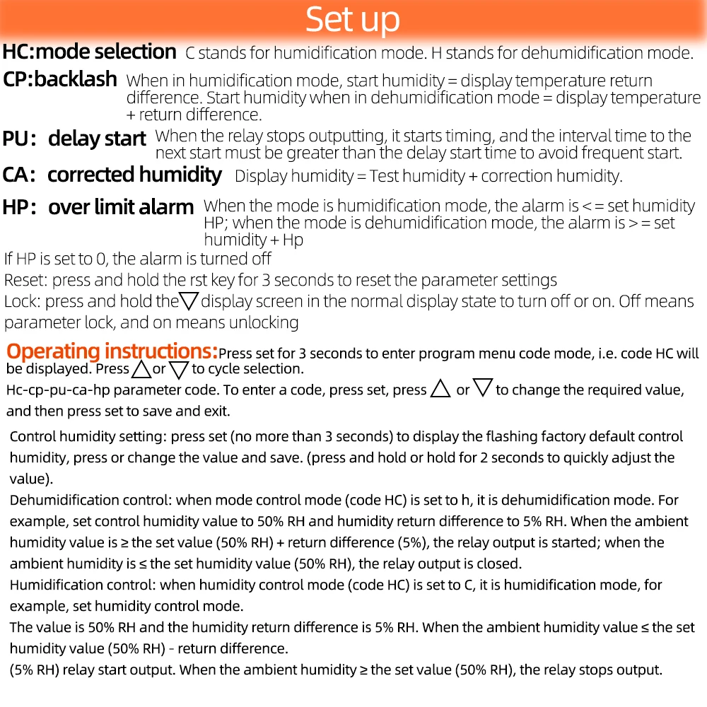 Набор: нажмите клавишу SET, чтобы ввести настройки контроля влажности, и нажмите клавишу ▲ или ▼ для настройки.