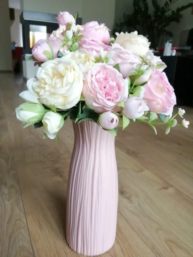 The pictures and description shown are deceptive, it says ceramic plastic and pics show as if made of solid plastic but actually it is very thin molded plastic which cannot bear the weight of the flowers. It was not properly bubble packed as well, resulting in bent top collar when it arrived. Also, the vase is wobbly and is not stable when made to stand on a smooth surface. I don't recommend this product.