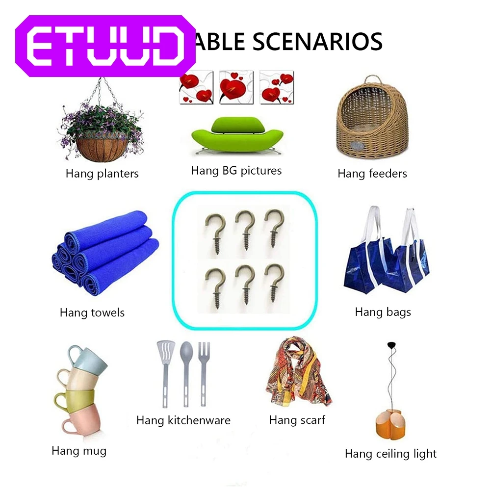 Легко устанавливается. Эти винтовые крючки имеют сужающиеся концы, которые хорошо подходят для вас, чтобы легко подключить их к стене, потолку или другим поверхностям.