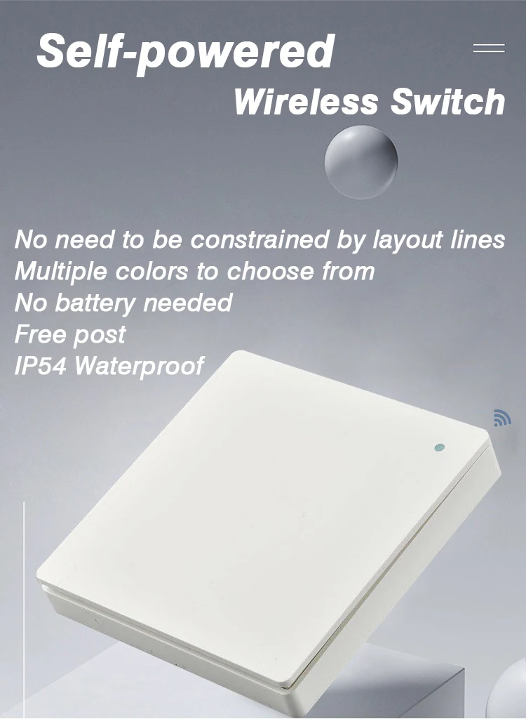 Автономный беспроводной переключатель добавляет приемник к соединению светильник том и проводом. Переключатель не требует подключения; Внутри переключателя есть автономный модуль, который преобразует кинетическую энергию, генерируемую нажатием в электромагнитную энергию, а затем в компоненты электропривода. Устройство излучает радиочастотные сигналы. Приемник включает или выключает свет при получении сигнала.