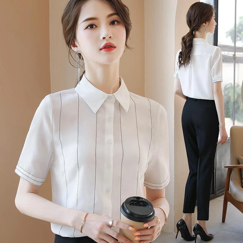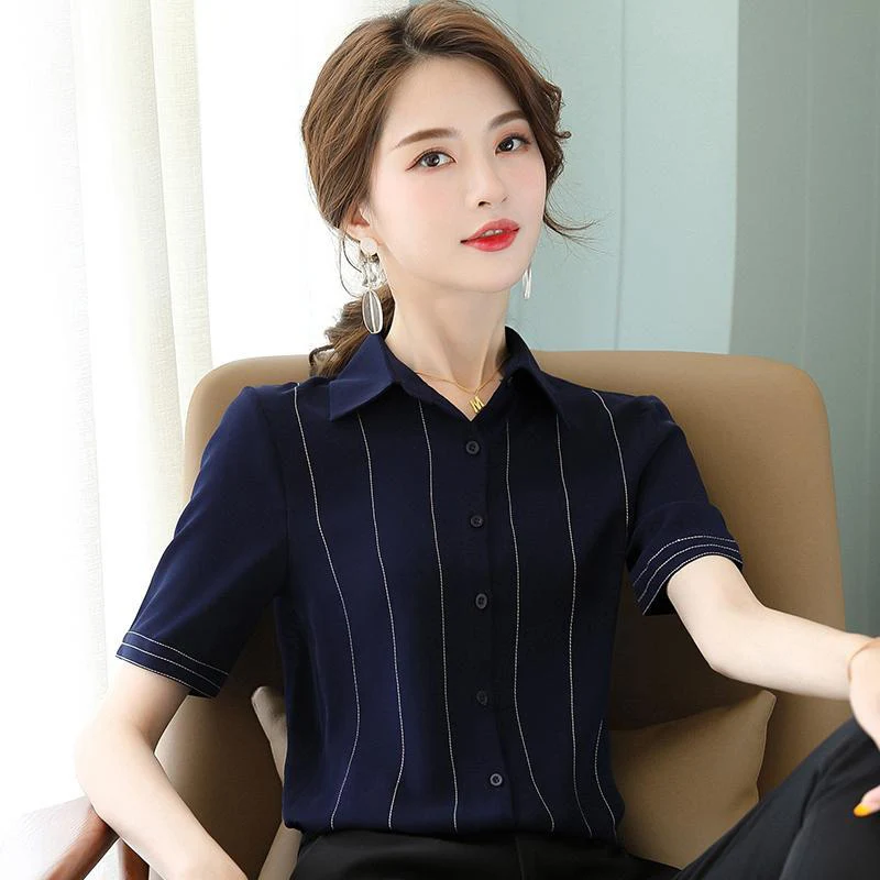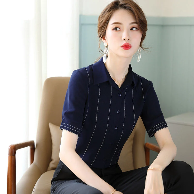 Женская летняя Стильная женские блузки рубашки одежда для офиса с коротким рукавом и отложным воротником в полоску офисные Блузы Топы DF4029