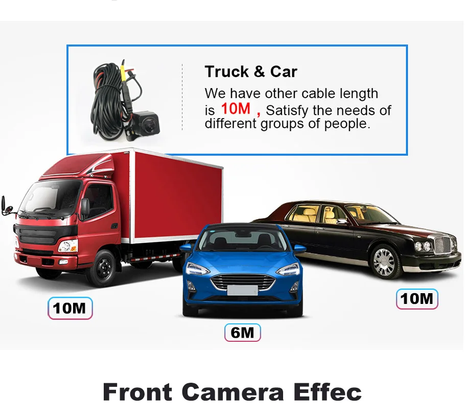 Есть 2 длины задней камеры (до 10 метров) может быть выбран, подходит для автомобилей различной длины. Пожалуйста, выберите заднюю камеру в соответствии с длиной вашего автомобиля.