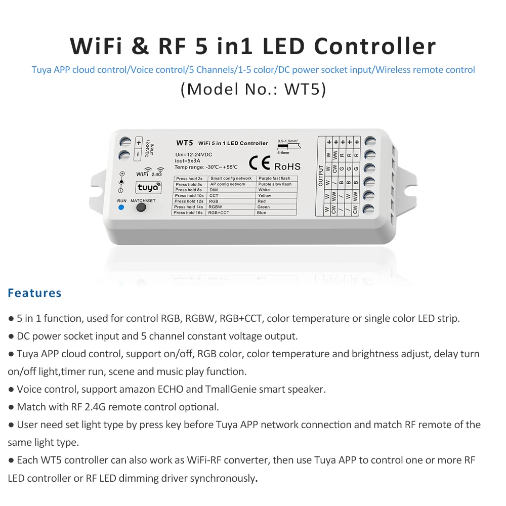 ● Функция 5 в 1, используется для управления RGB, RGBW, RGB + CCT, цветовая температура или одноцветная светодиодный лента.● Входное напряжение постоянного тока и 5 каналов постоянного напряжения.● Облачное управление Tuya APP, поддержка включения/выключения, RGB цвет, цветовая температура и регулировка яркости, Задержка включения/выключения светильник, таймер, функция воспроизведения сцены и музыки.● Голосовое управление, поддержка amazon ECHO и TmallGenie smart speaker.● Совместимость с пультом дистанционного управления RF 2,4G опционально.● Пользователя необходимо установить светильник типа регулятор нажатия кнопки перед приложение Tuya сетевое подключение и матч RF пульт дистанционного управления одной и той же светильник типа.● Каждый контроллер WT5 также может работать в качестве WiFi-RF конвертера, а затем использовать приложение Tuya для управления одним или несколькими RF светодиодный контроллером или RF светодиодный драйвер затемнения синхронно