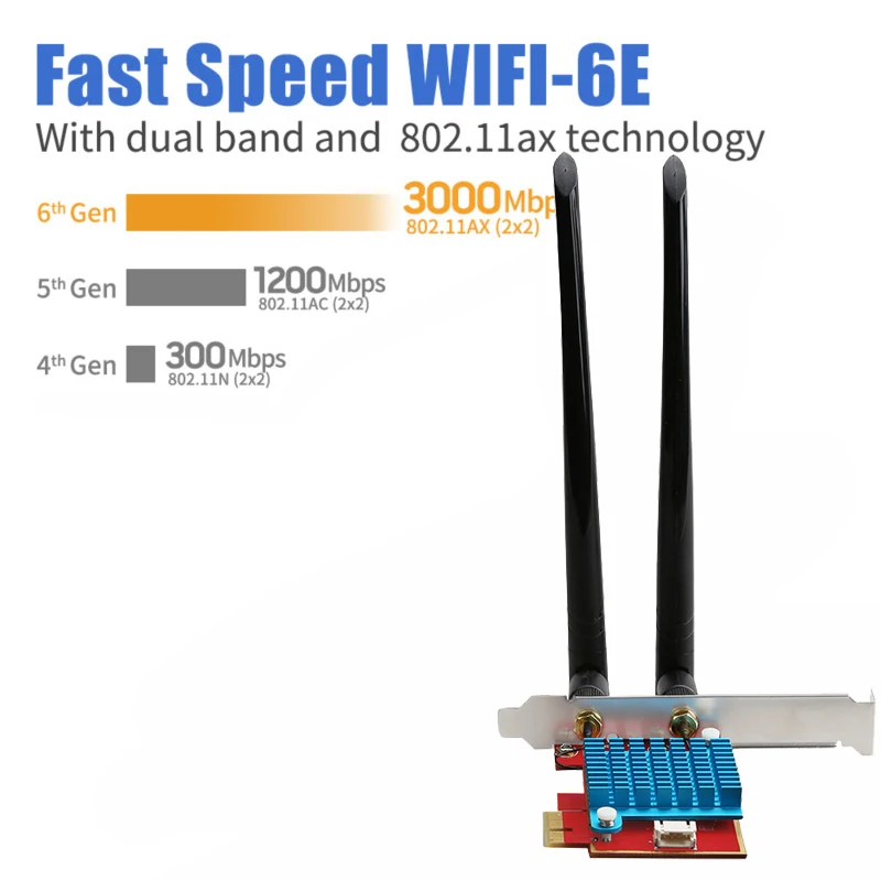 Chipest: чипсет Intel AX210;Новый Wi-Fi 6E с Blutetooth 5,2;Стандарт IEEE: 802.11ax/ac/a/b/g/n;Двухдиапазонный 2,4 ГГц-300 Мбит/с/5Ghz-2400Mbps;Примечание: скорость до 2400 Мбит/с (маршрутизатор должен поддерживать 802.11ax);Поддержка MU-MIMO;Операционные системы: Поддержка только Windows 10*64 бит и Linux;Совместимость с: почти компьютером с PCI Express (разъем PCI-E 1X/4X/16X);Антенны с высоким коэффициентом усиления 6DBi обеспечивают лучший прием сигнала.