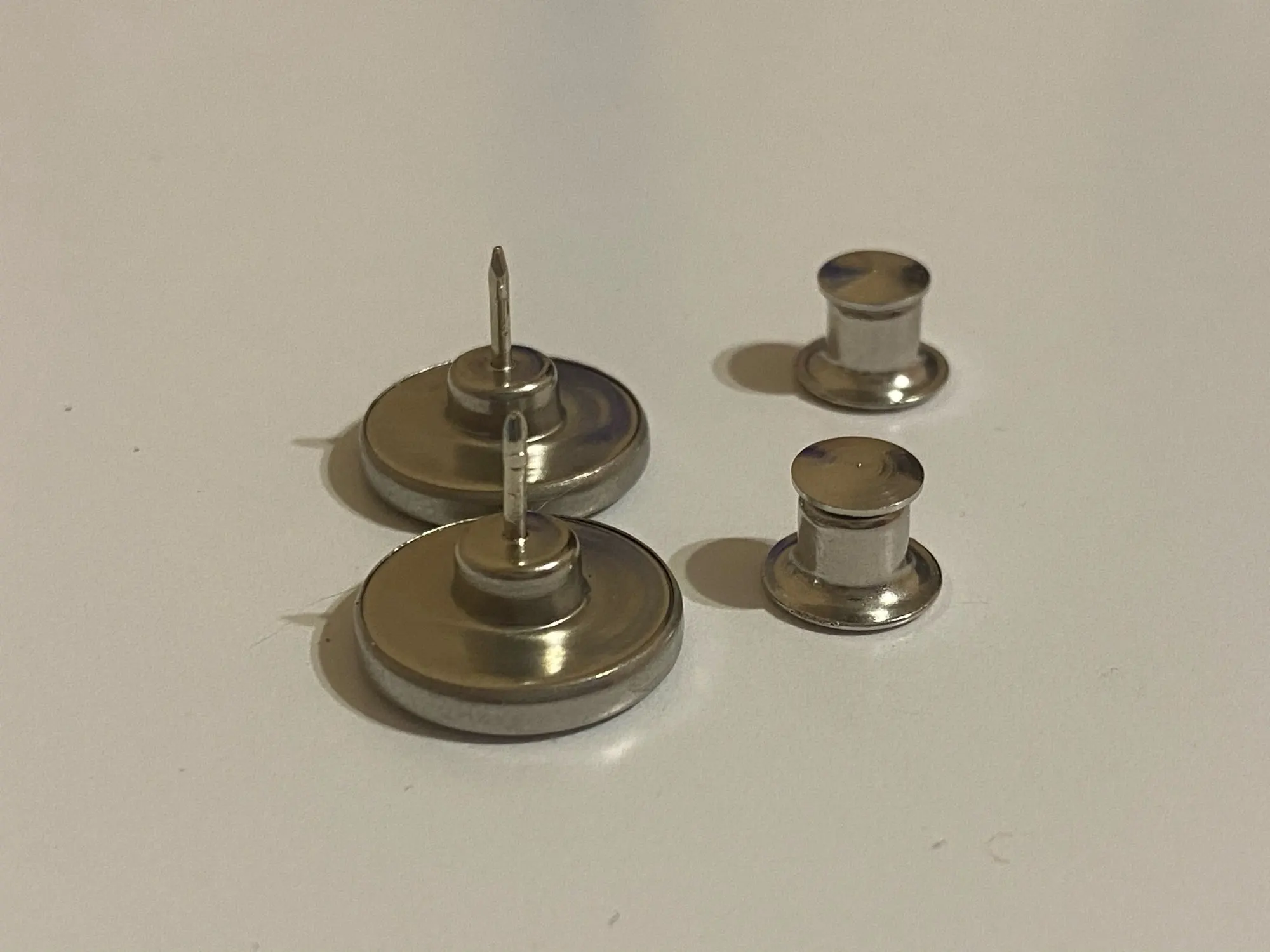 очень крутые СЪЕМНЫЕ пуговицы. легко входят в джинсу, сначала запуталась как их отсоеденить, но нужно просто потянуть за самый край не тянув движущуюся "платформу". покупала серый цвет, подходит под любой цвет. рекоммендую