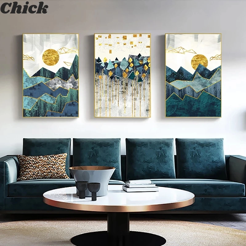 Настенная картина в скандинавском стиле с абстрактным геометрическим изображением горного пейзажа, холст с изображением золотого солнца, Настенная картина для гостиной