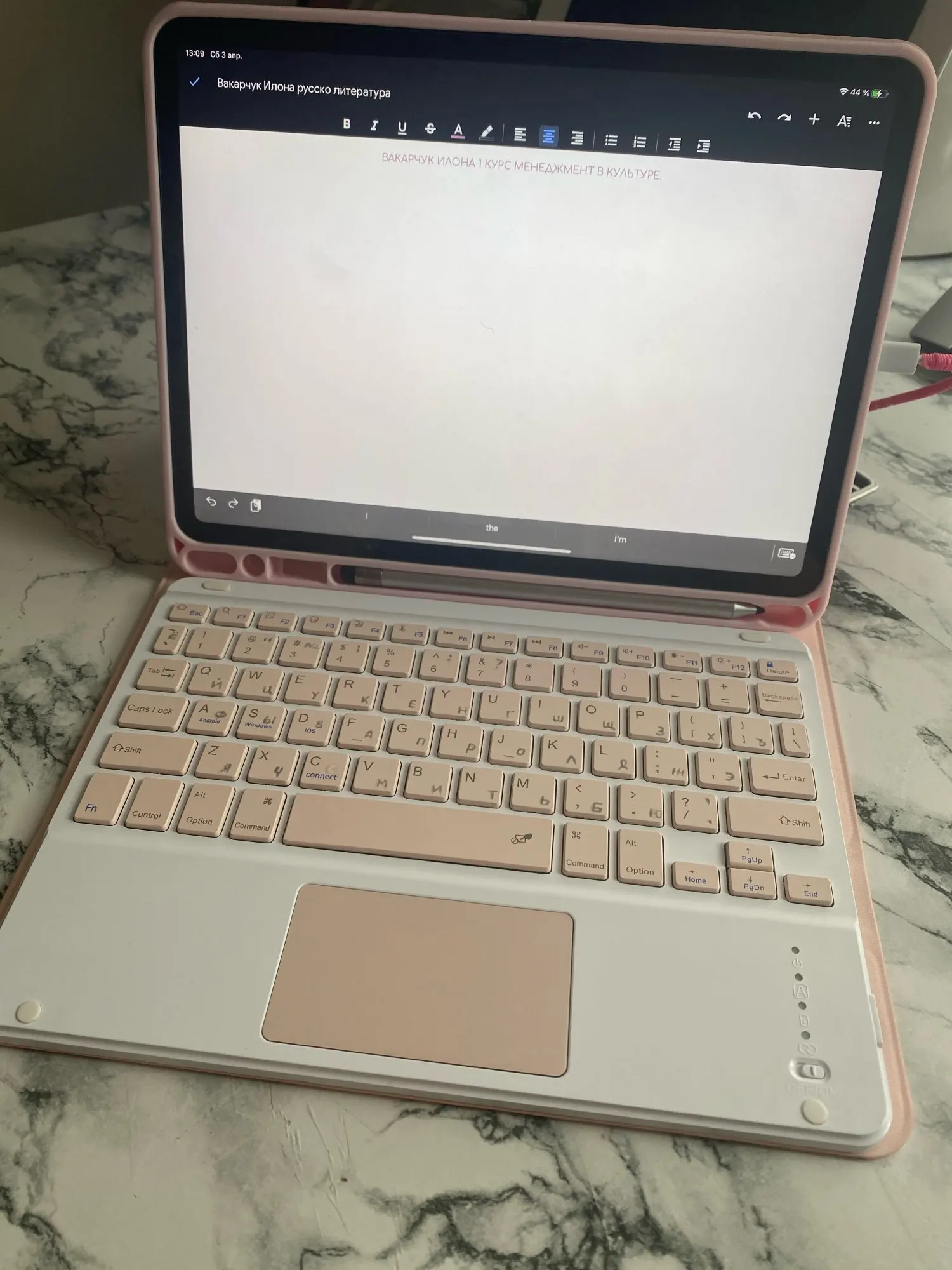 Пришла очень быстро в Московскую область, буквально за две недели. Привёз курьер домой! Клавиатура шикарно, всё работает, качество супер, чехол тоже, есть провод для зарядки. Раскладка только английская, сама дописала русские буквы. Чехол из кожи.