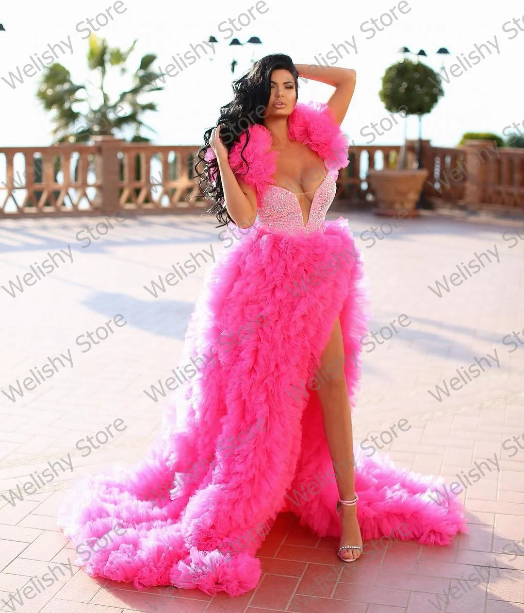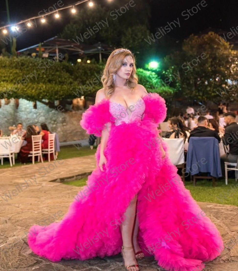 Женское плиссированное платье из тюля Pretty, розовое длинное вечернее платье с высоким разрезом, блестками и оборками, платье со съемными рукавами