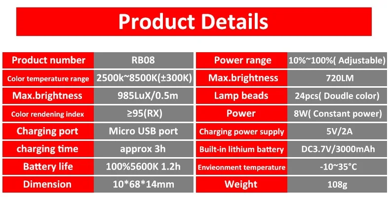 Двухцветный СВЕТОДИОДНЫЙ светильник Viltrox RB08 2500K-8500K, миниатюрный светильник со встроенным аккумулятором для видео Youtube и Tik Tok