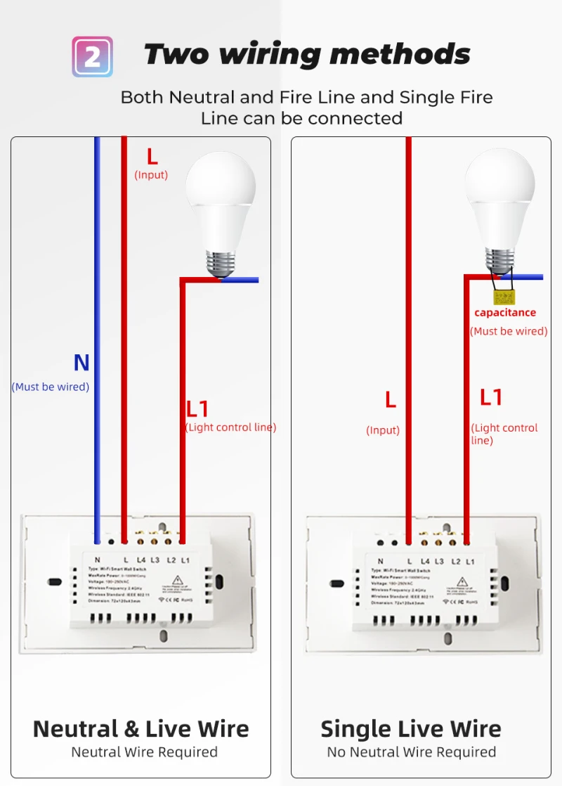 【Два способа подключения 】поддержка нейтральной системыИ нет нейтральной системы.Поддержка одной пожарной системы,Но вам нужен конденсатор, когда вы не используете нейтральныйСистема. (конденсатор включен.) 【Четыре метода управления】APPКонтроль+ Голосовое управление + 433 МГц RFБеспроводная связьПереключатель+ ПереключательСенсорное управление